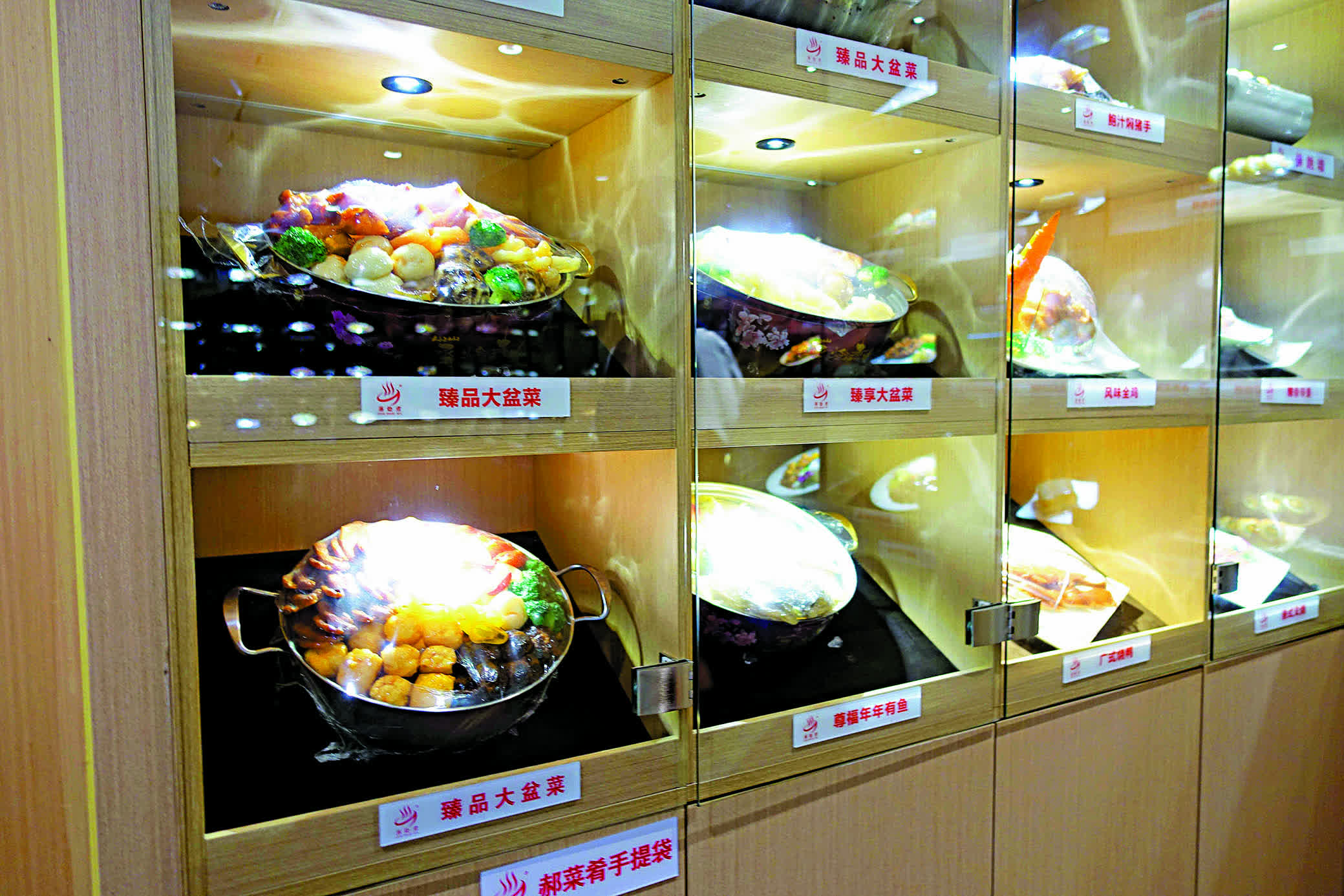 台商白金梁的預製菜企業總部位於粵港澳大灣區面積最大的城市──肇慶。工廠樓層並不算太高,布局十分簡約現代化。工廠內停着數輛冷鏈貨車,寬闊的車道上還豎起了一個紅色的龍門架標識桿,上面寫着「愛心,用心,恆心,忠心,責任心,感恩之心」。這「六心」正是台商白金梁的經營理念。從蘇州菜、東北菜、淮揚菜、魯菜、台灣菜,到美國、日本、意大利菜餚……辦公室內,最醒目的是透明玻璃櫥窗內琳琅滿目的菜式樣品。這2000多道菜餚足足擺滿了數面牆。在菜式上,從中國幾大菜系到海外不同國家的特色菜,包羅萬有;在種類上,從家常菜、學生餐到高端菜餚,一應俱全。