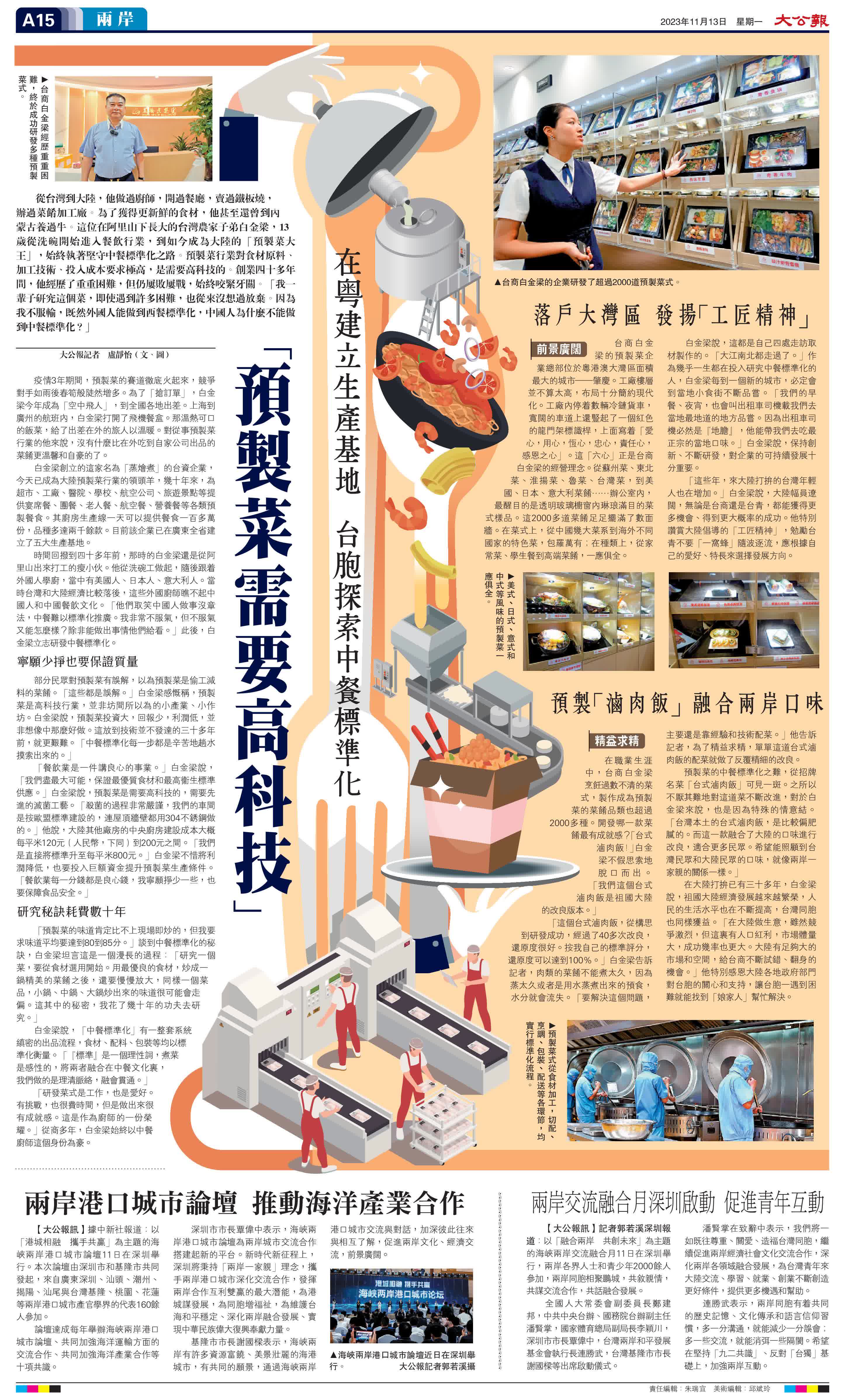 (大公報記者 盧靜怡)從台灣到大陸,他做過廚師,開過餐廳,賣過鐵板燒,辦過菜餚加工廠。為了獲得更新鮮的食材,他甚至還曾到內蒙古養過牛。這位在阿里山下長大的台灣農家子弟白金梁,13歲從洗碗開始進入餐飲行業,到如今成為大陸的「預製菜大王」,始終執著堅守中餐標準化之路。預製菜行業對食材原料、加工技術、投入成本要求極高,是需要高科技的。創業四十多年間,他經歷了重重困難,但仍屢敗屢戰,始終咬緊牙關。「我一輩子研究這個菜,即使遇到許多困難,也從來沒想過放棄。因為我不服輸,既然外國人能做到西餐標準化,中國人為什麼不能做到中餐標準化?」