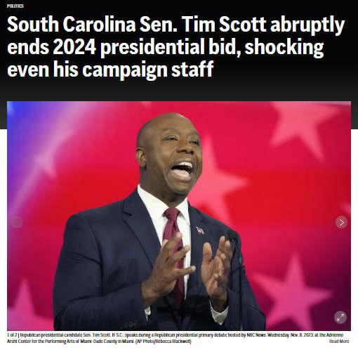 據報道,斯科特12日在參加一檔夜間節目時突然宣布了該消息。他的這一決定出乎外界意料,也讓其工作人員感到震驚。就在斯科特宣布退選的13分鐘前,他的競選團隊還在呼籲支持者捐款。