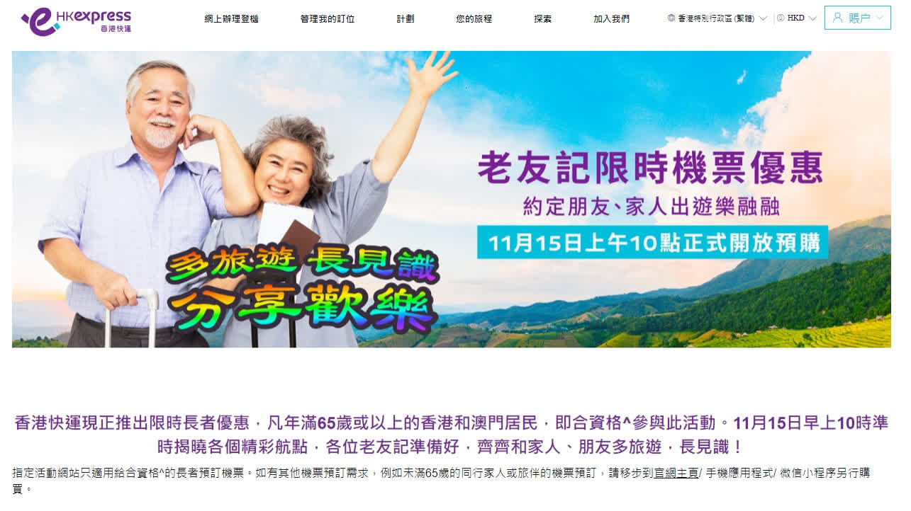 由11月15日上午10時至11月19日晚11時59分期間,凡年滿65歲或以上的香港或澳門居民,透過香港快運優惠訂購專頁預訂指定航班,並於2023年11月23日至2024年3月31日期間出發,即可享此特別優惠,並不限訂購次數。優惠名額有限,先到先得。