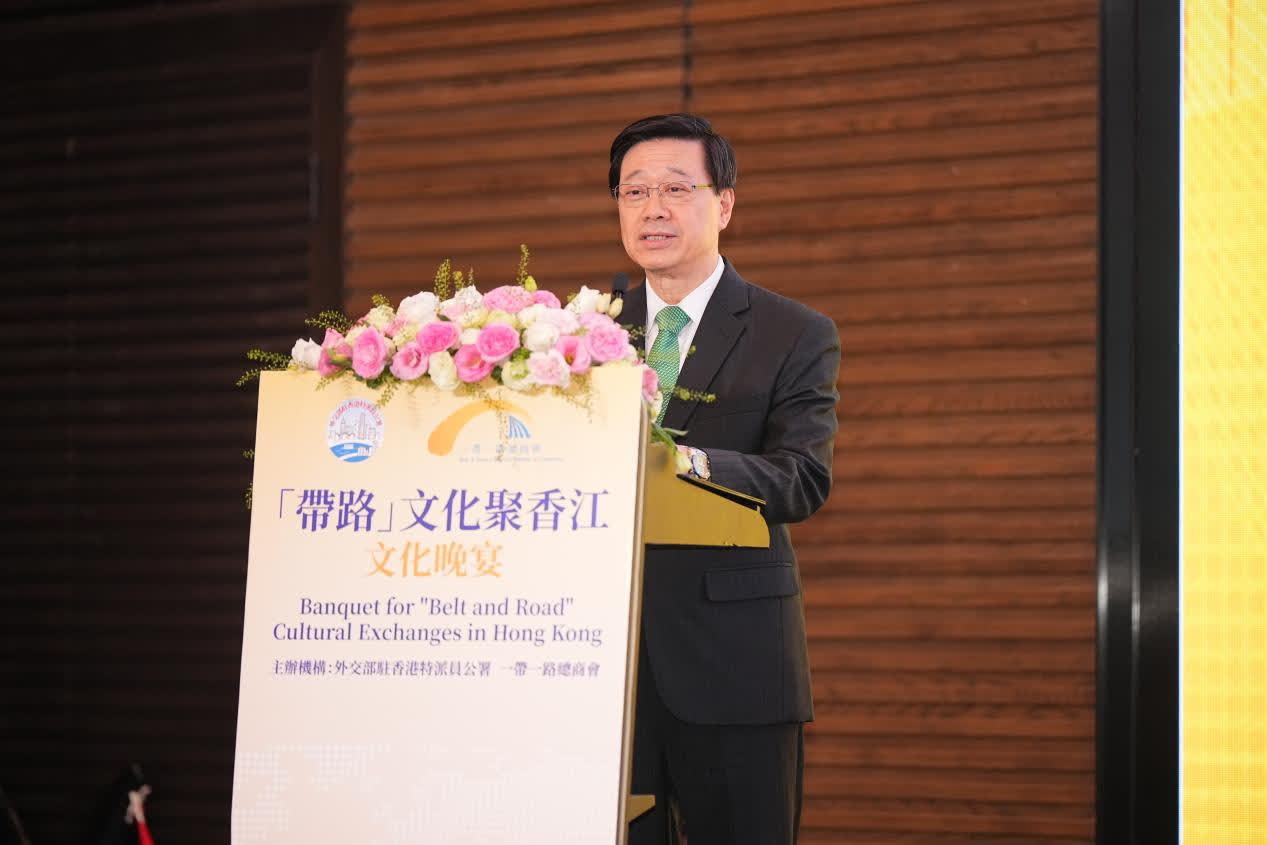 李永勝在祝酒詞中特別提及,「一帶一路」倡議傳承開放包容、交流互鑒的絲路精神,和沿線國家一道築就共同發展的機遇之路、繁榮之路。林建岳和「一帶一路」總商會提議舉辦「『帶路』文化聚香江」文化晚宴,極富創意、極具意義。特別是香港薈萃了中西餐飲文化,素有「美食天堂」的盛譽。在這裡舉辦這樣一場文化夜宴,也是香港在共建「一帶一路」中獨特優勢和角色的一種體現。歡迎各國駐港機構充分挖掘以香港為平台參與「一帶一路」共建的廣闊機遇,共用發展紅利。期待一帶一路總商會等民間力量,發揮自身所長,多多「走出去」「請進來」,為促進「一帶一路」的貿易暢通、民心相通發揮積極作用。