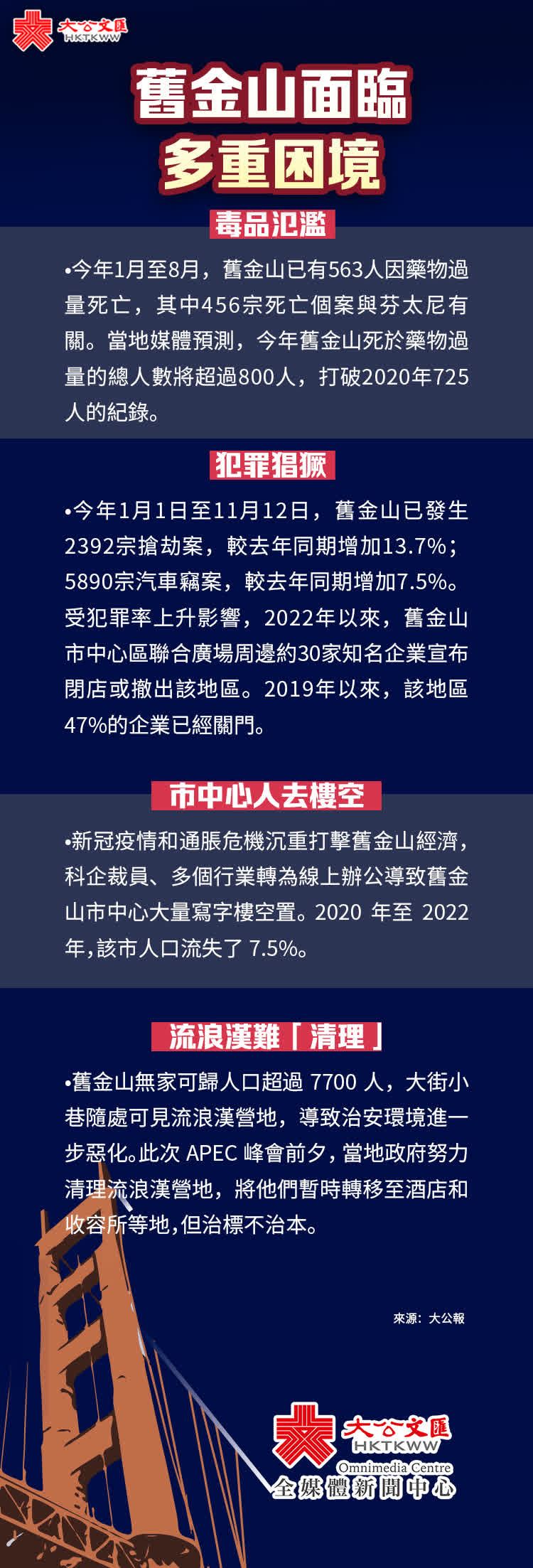 大公報綜合《紐約時報》、《每日郵報》報道:亞太經合組織(APEC)第三十次領導人非正式會議於15日至17日在美國加州舊金山召開。會議前夕,加州州長紐森和舊金山市政府大力整頓市容、改善治安,但依然發生了意外事件:12日,捷克電視台的採訪團隊當街遭遇持槍搶劫,價值逾1.8萬美元的器材被搶走。一名舊金山媒體的主播透露,當地媒體人員外出工作時經常邀請警察或保安隨行,以確保安全。