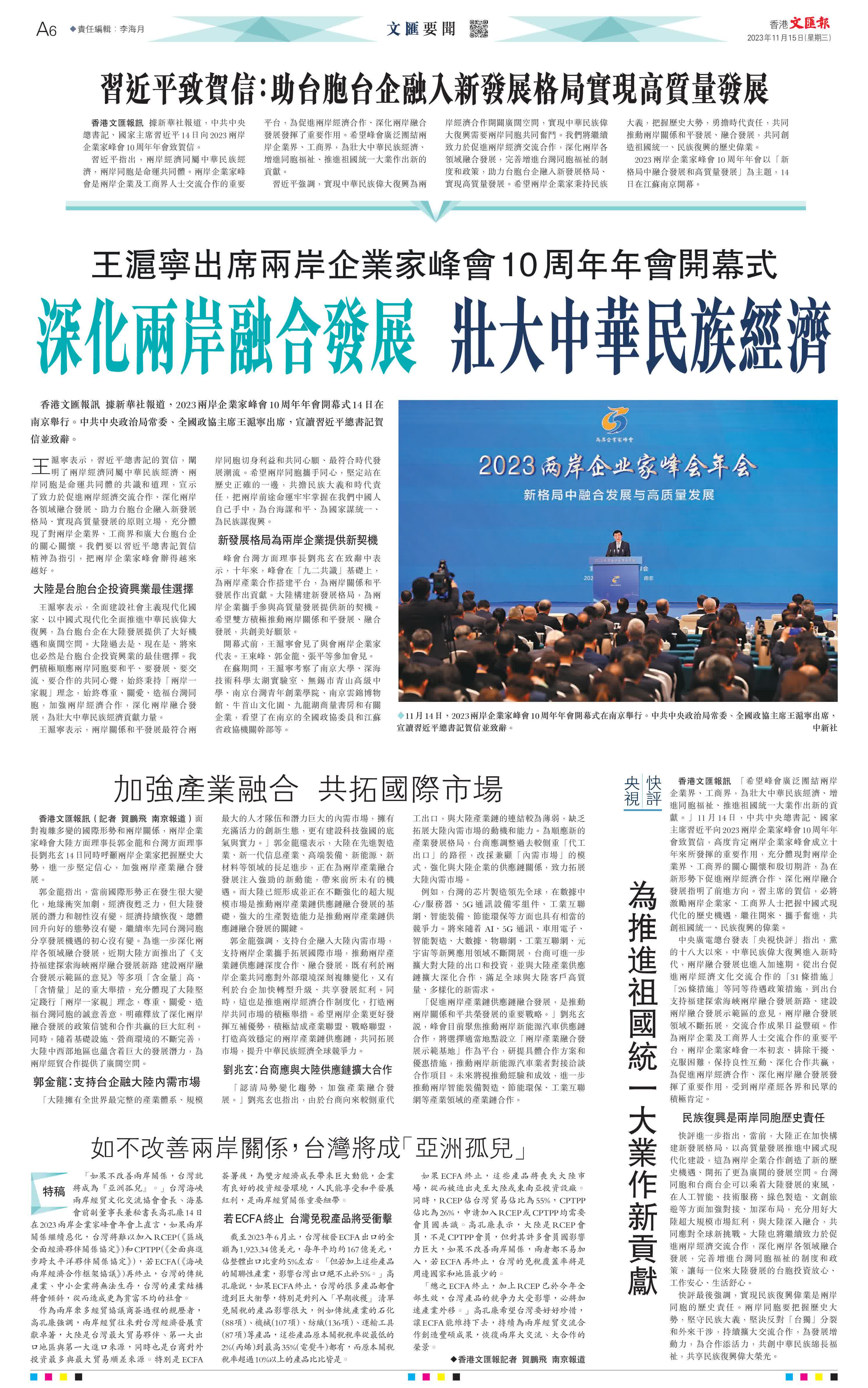 香港文匯報綜合本報記者賀鵬飛、新華社報道,2023兩岸企業家峰會10周年年會開幕式14日在南京舉行。中共中央政治局常委、全國政協主席王滬寧出席,宣讀習近平總書記賀信並致辭。