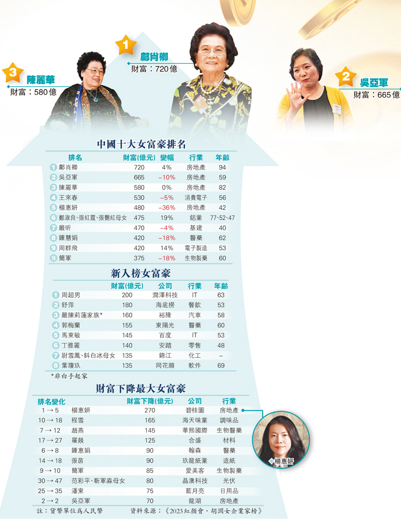 (香港文匯報 記者 蔡競文、周曉菁)2023年胡潤女企業家榜出爐,新鴻基地產郭老太鄺肖卿首次晉身中國女首富,其財富按年上漲25億元(人民幣,下同),至720億元,是18年來榜單中的第6位中國女首富。龍湖集團創始人吳亞軍,以665億元身家緊隨其後,但財富卻縮水近70億元。去年的女首富楊惠妍,則因碧桂園爆雷深陷債務危機、股價縮水,以480億元跌至第五。