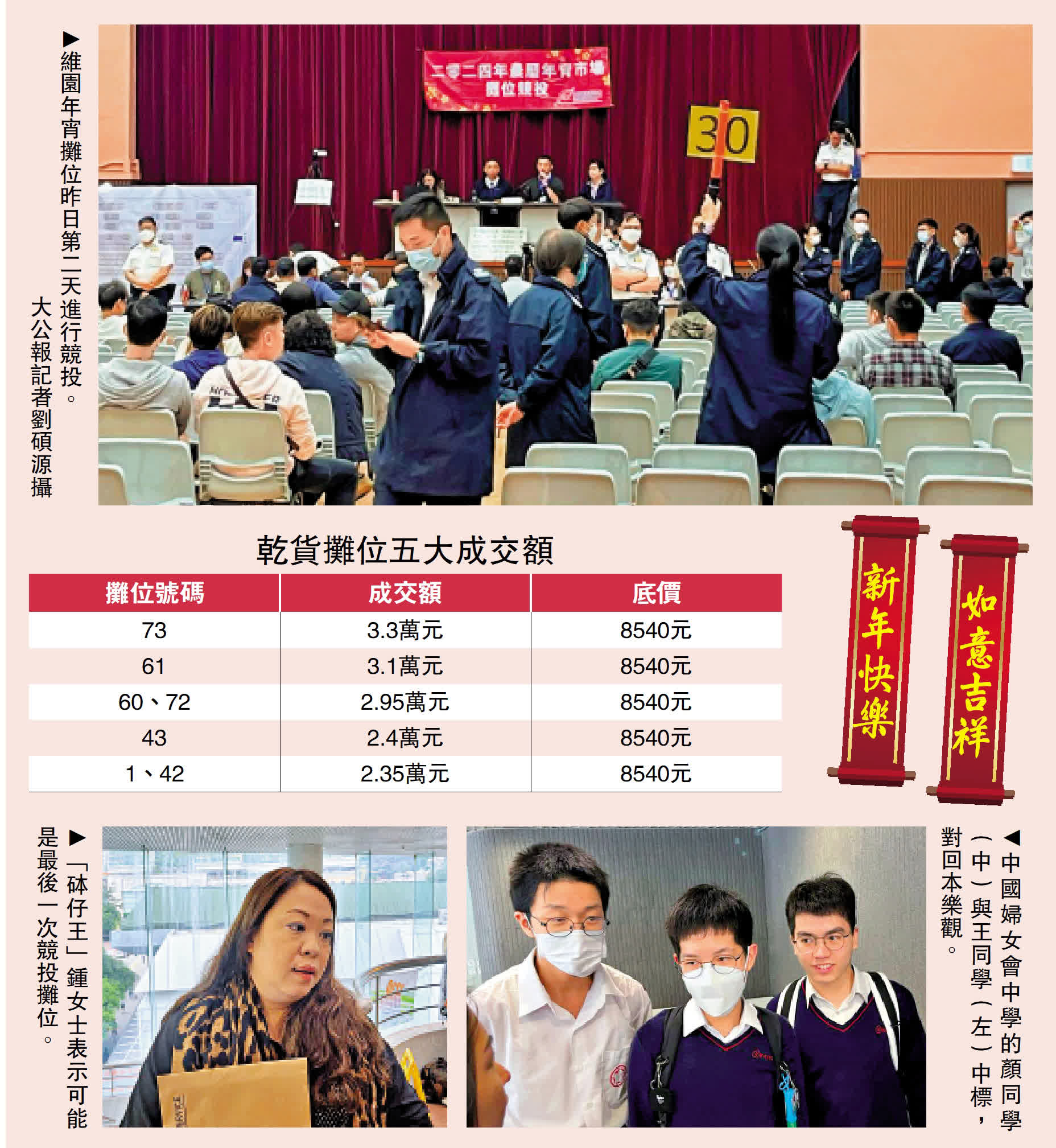 (大公報記者 劉碩源)維園年宵市場攤位競投昨日進入第二天,競投8個主題攤位以及82個乾貨攤位。乾貨攤位時隔4年再開,競投激烈,有攤位叫價近20次,乾貨攤位的最高成交價是底價約四倍。年宵「老手」砵仔王以2.95萬元再競得60號攤位,看好年宵人流量。今年亦有中學生入場創業,以9350元中標,對回本感到樂觀。