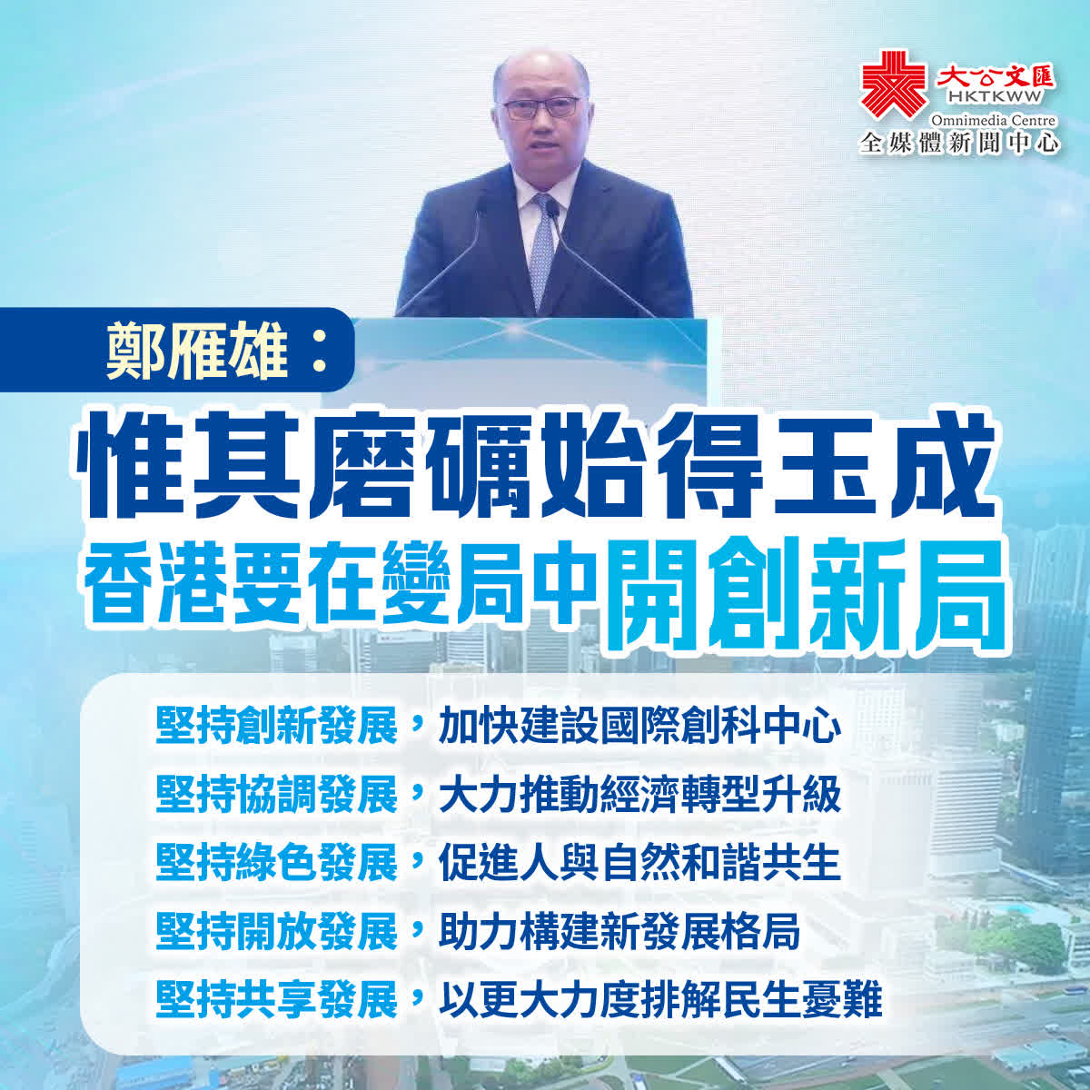 鄭雁雄指出,當前,兩個大局交相演進,中國式現代化萬馬奔騰、一往無前,世界有變數、香港有「着數」,中國有偉局、香港有新局,理念是行動的先導,香港要在變數之中實現「着數」、在變局之中開創新局,很大程度取決於思變、應變、求變,取決於自身發展理念的更新,取決於能否用高質量發展駕馭世界變數,實現香港「着數」,推動由治及興。