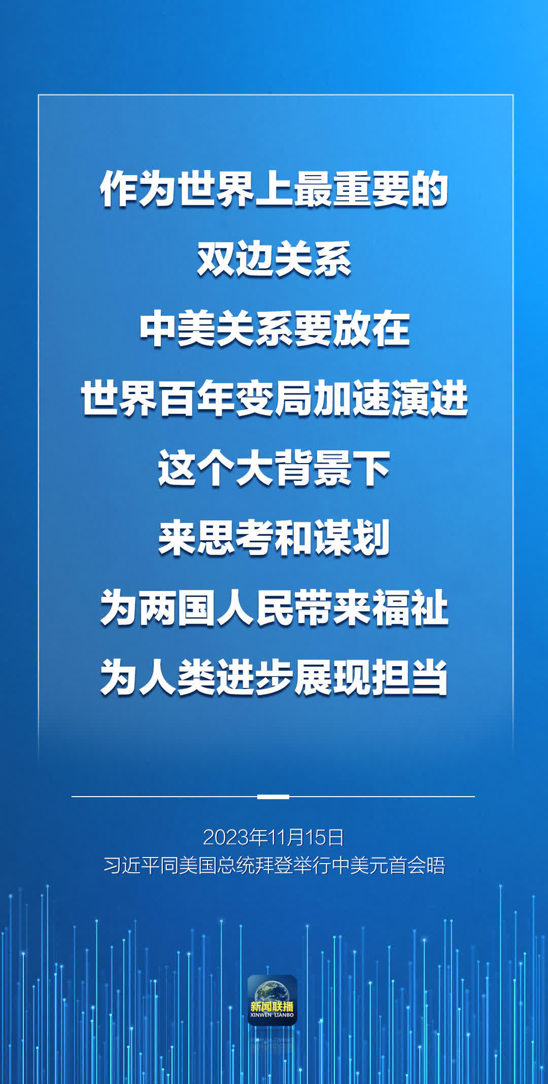 我和總統先生是中美關係的掌舵者,對人民、對世界、對歷史都擔負着沉甸甸的責任。我期待今天同總統先生就事關中美關係的戰略性、全局性、方向性問題,事關世界和平和發展的重大問題深入交換意見,達成新的共識。