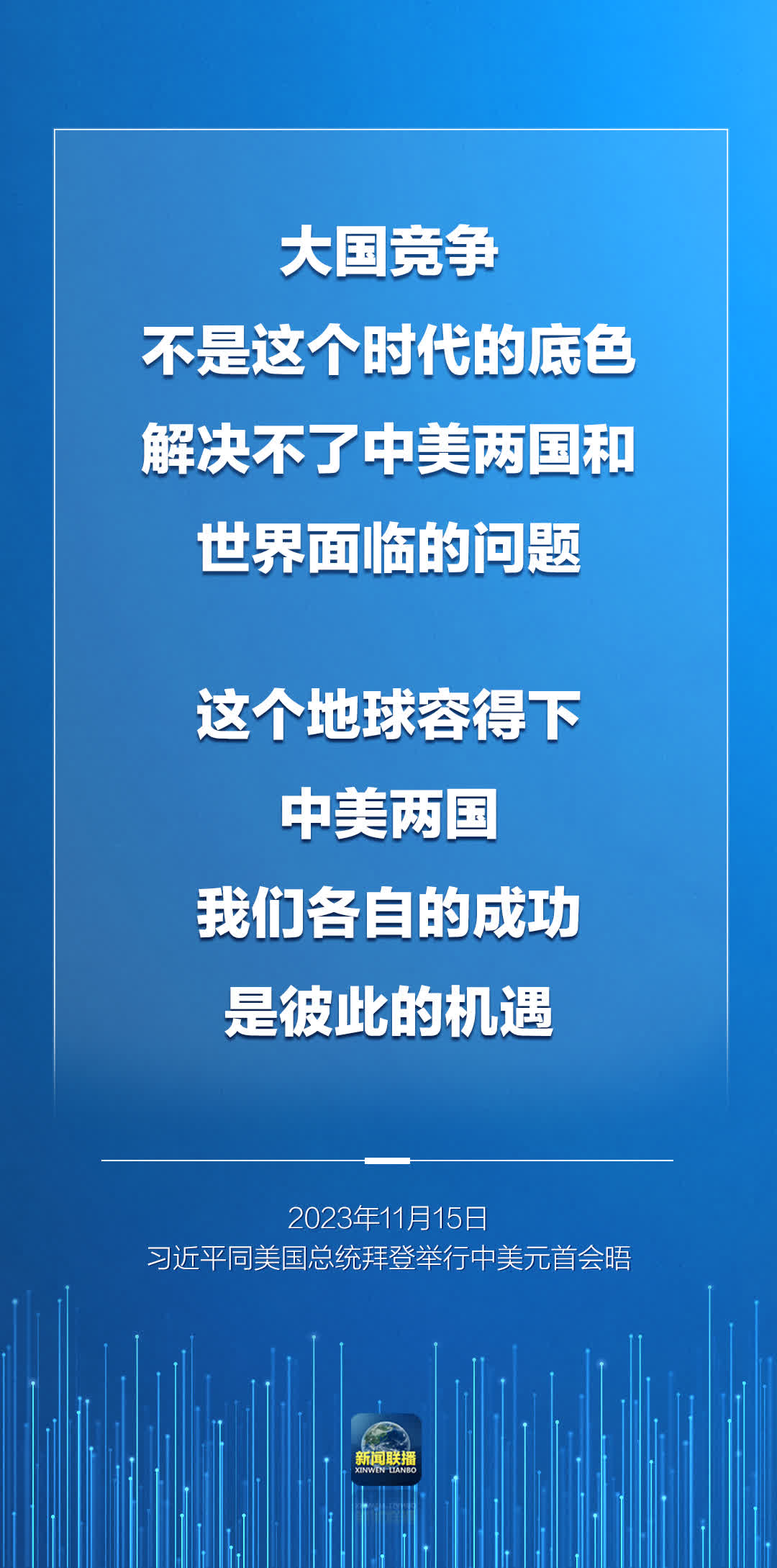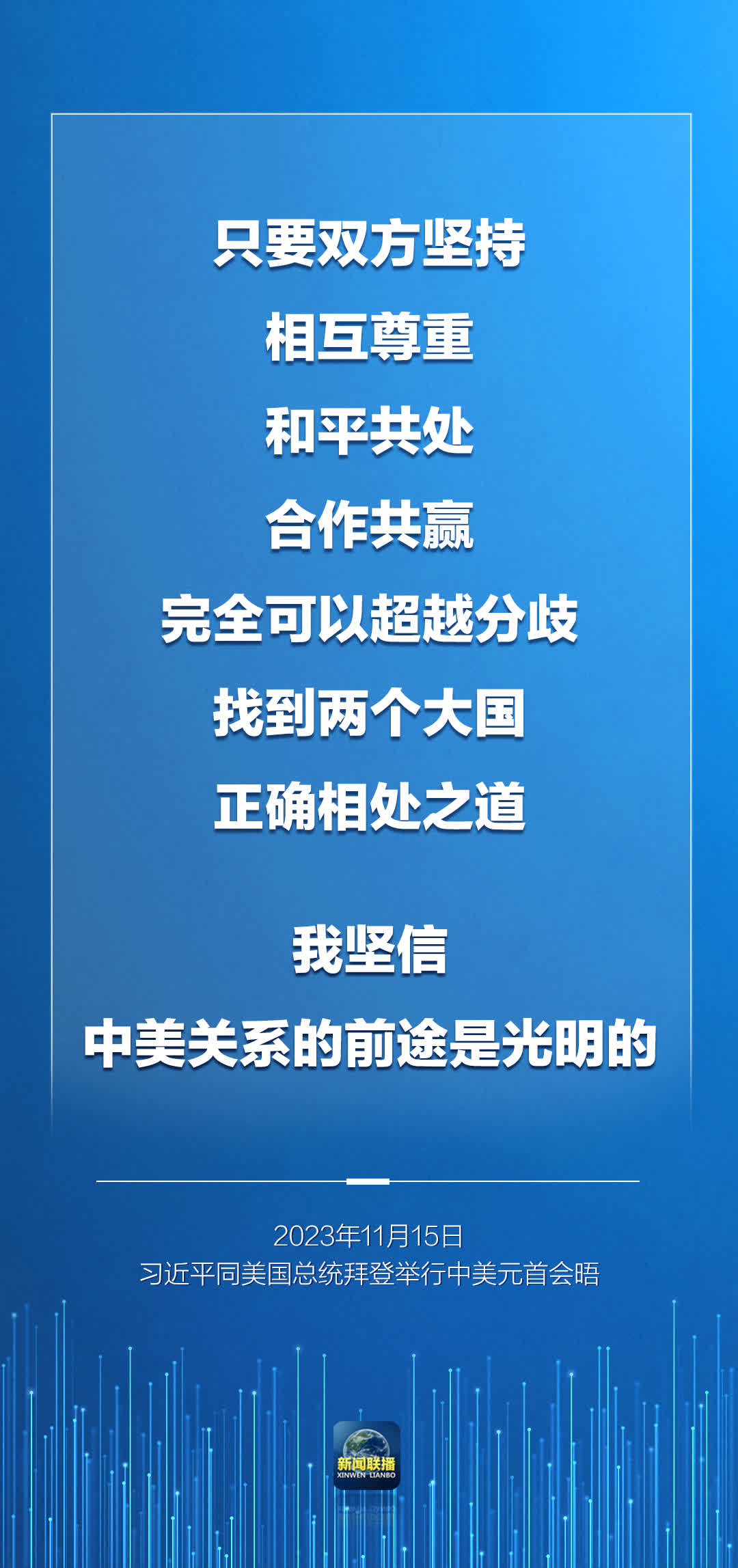 我還是那個看法,大國競爭不是這個時代的底色,解決不了中美兩國和世界面臨的問題。這個地球容得下中美兩國,我們各自的成功是彼此的機遇。中美兩國歷史文化、社會制度、發展道路不同,這是客觀現實。但是,只要雙方堅持相互尊重、和平共處、合作共贏,完全可以超越分歧,找到兩個大國正確相處之道。我堅信,中美關係的前途是光明的。