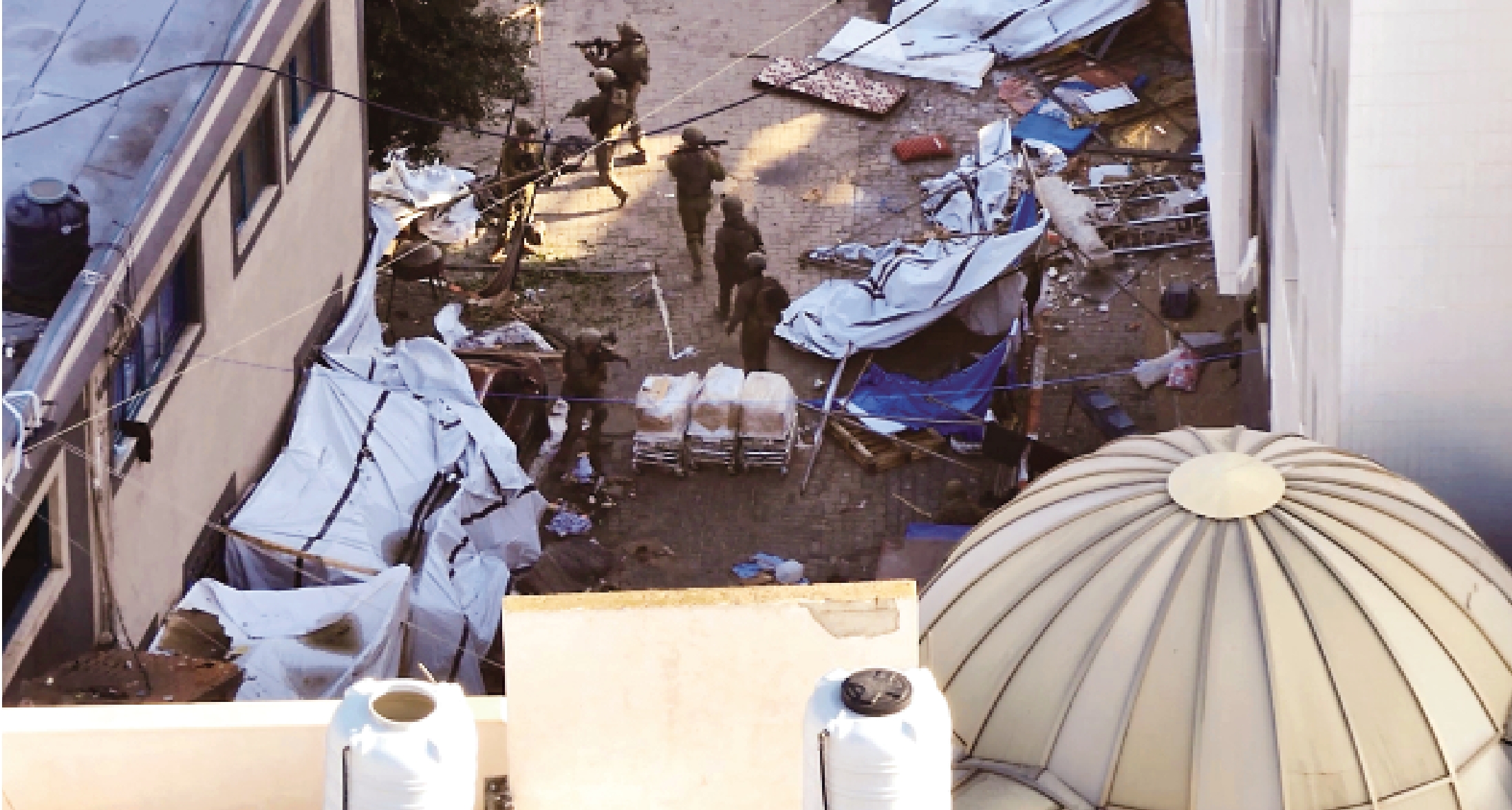 •超過200人被帶到醫院大樓前面的空地上,三輛以軍坦克將他們包圍,部分人被扒光衣服、蒙住眼睛。