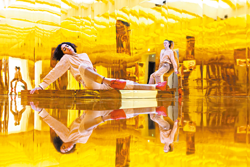 第一個房間是出乎意料的刺目的白,如同廣袤延伸的超現實空間,地上鋪着柔軟的地毯。舞者如同被「放置」在中心金色的長椅上,以非常緩慢的速度活動着。第二個房間則是滿眼的金,環繞的鏡面讓人形折射出多個重影,有着某種巴洛克式古典美學的指涉。舞者與觀眾的分身重影層層疊疊,共同完成了這個作品。