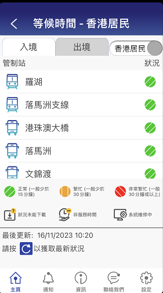 出入境口岸的實時狀況每隔15分鐘更新一次,亦可自行刷新,用戶可自選「香港居民」或「訪港旅客」進行查看。等候狀況分為正常、繁忙及非常繁忙三個等級。當狀況顯示綠色,代表人流客量正常,等候時間一般少於15分鐘;狀況顯示為黃色則代表口岸繁忙,等候時間一般少於30分鐘;當顯示為紅色,即代表口岸非常繁忙,等候時間需30分鐘或以上。