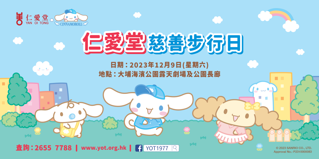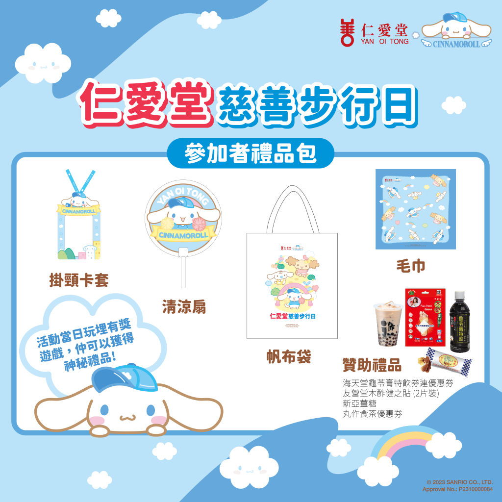 「仁愛堂慈善步行日」活動大使——Sanrio人氣角色Cinnamoroll(玉桂狗)將會與參加者結伴慈善步行,一同身體力行傳揚愛心。步行路線全長約1.5公里,沿途除可欣賞大埔海濱長廊優美的景色外,更可與Cinnamoroll及朋友仔拍照打卡,每位參加者均可獲豐富禮品包,包括主題限定帆布袋、掛頸卡套、毛巾及清涼扇;完成整個步行路線後,更可換取限量版Cinnamoroll精美禮品乙份。