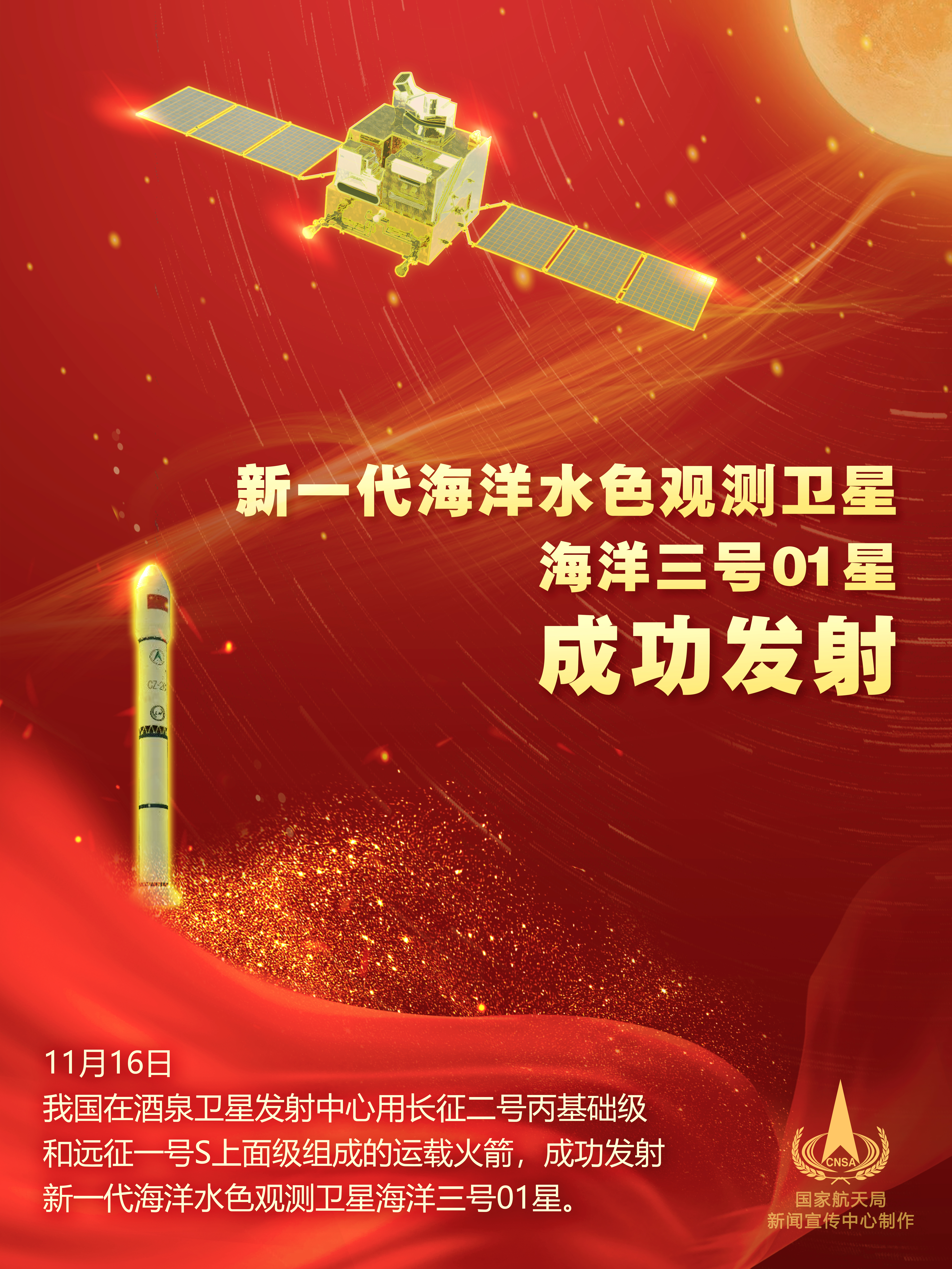 (大公文匯全媒體記者 劉凝哲 北京報道)記者從國家航天局獲悉,今日(11月16日)11時55分,中國在酒泉衛星發射中心用長征二號丙基礎級和遠征一號S上面級組成的運載火箭,成功發射新一代海洋水色觀測衛星海洋三號01星。該衛星指標達到國際水色遙感衛星先進水平,可滿足中國海洋環境監測的主體業務需求,並能夠服務於生態文明建設、智慧海洋工程建設、「一帶一路」倡議等國家重大戰略需求。