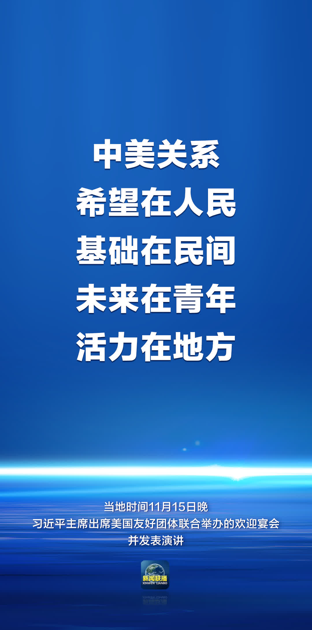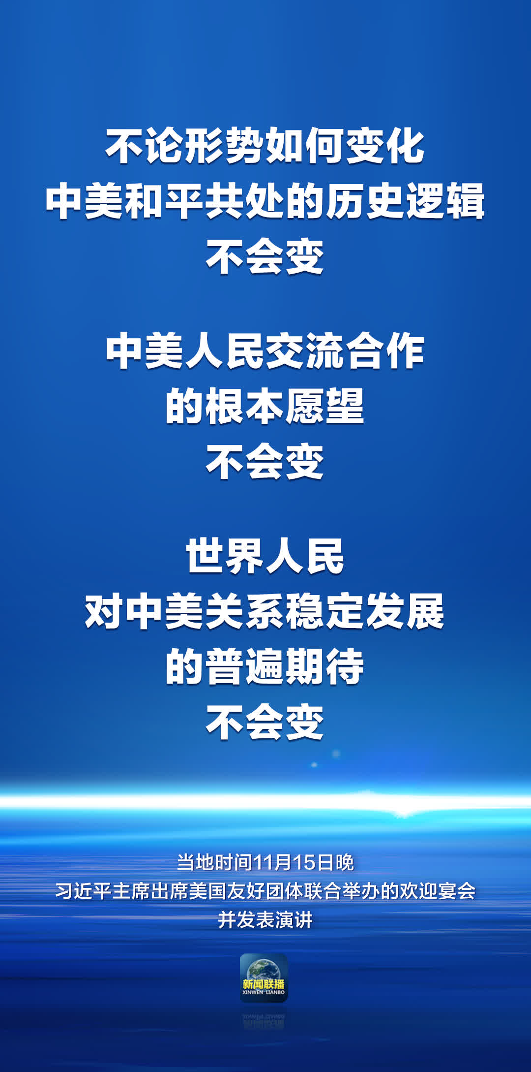 習近平指出,歷史長河大浪淘沙,最終沉澱下來的總是最有價值的東西。不論形勢如何變化,中美和平共處的歷史邏輯不會變,中美人民交流合作的根本願望不會變,世界人民對中美關係穩定發展的普遍期待不會變。任何一項偉大事業要成功都必須從人民中找到根基、從人民中集聚力量、由人民來共同完成。中美友好就是這樣一項偉大事業。讓我們匯聚起兩國人民的力量,賡續中美友誼,推進中美關係,為促進世界的和平和發展作出更大貢獻!