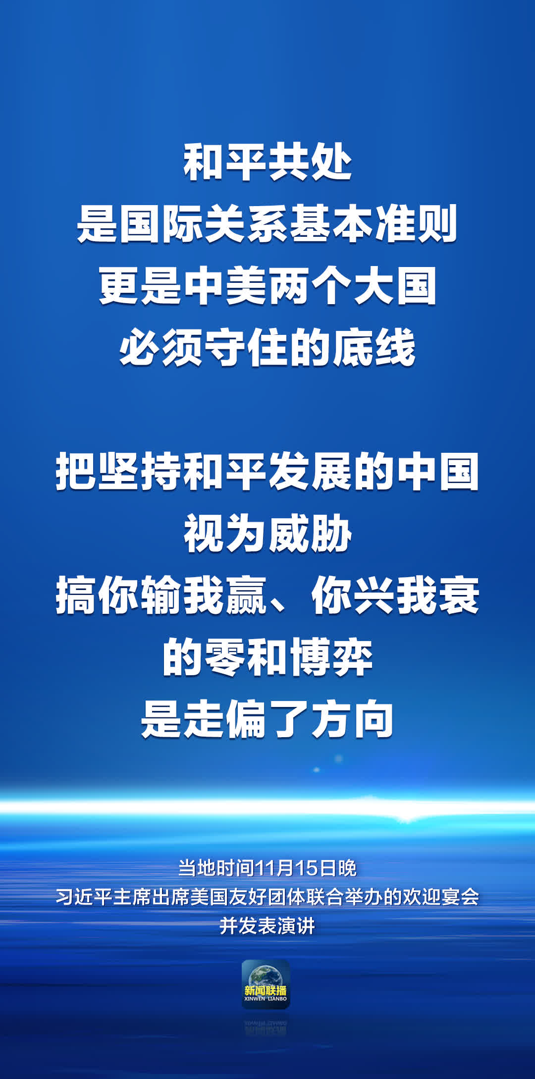 和平共處是國際關係基本準則,更是中美兩個大國必須守住的底線。把堅持和平發展的中國視為威脅,搞你輸我贏、你興我衰的零和博弈是走偏了方向。中國從不賭美國輸,從不干涉美國內政,無意挑戰和取代美國,樂見一個自信開放、發展繁榮的美國。同樣,美國也不要賭中國輸,不要干涉中國內政,應該歡迎一個和平、穩定、繁榮的中國。