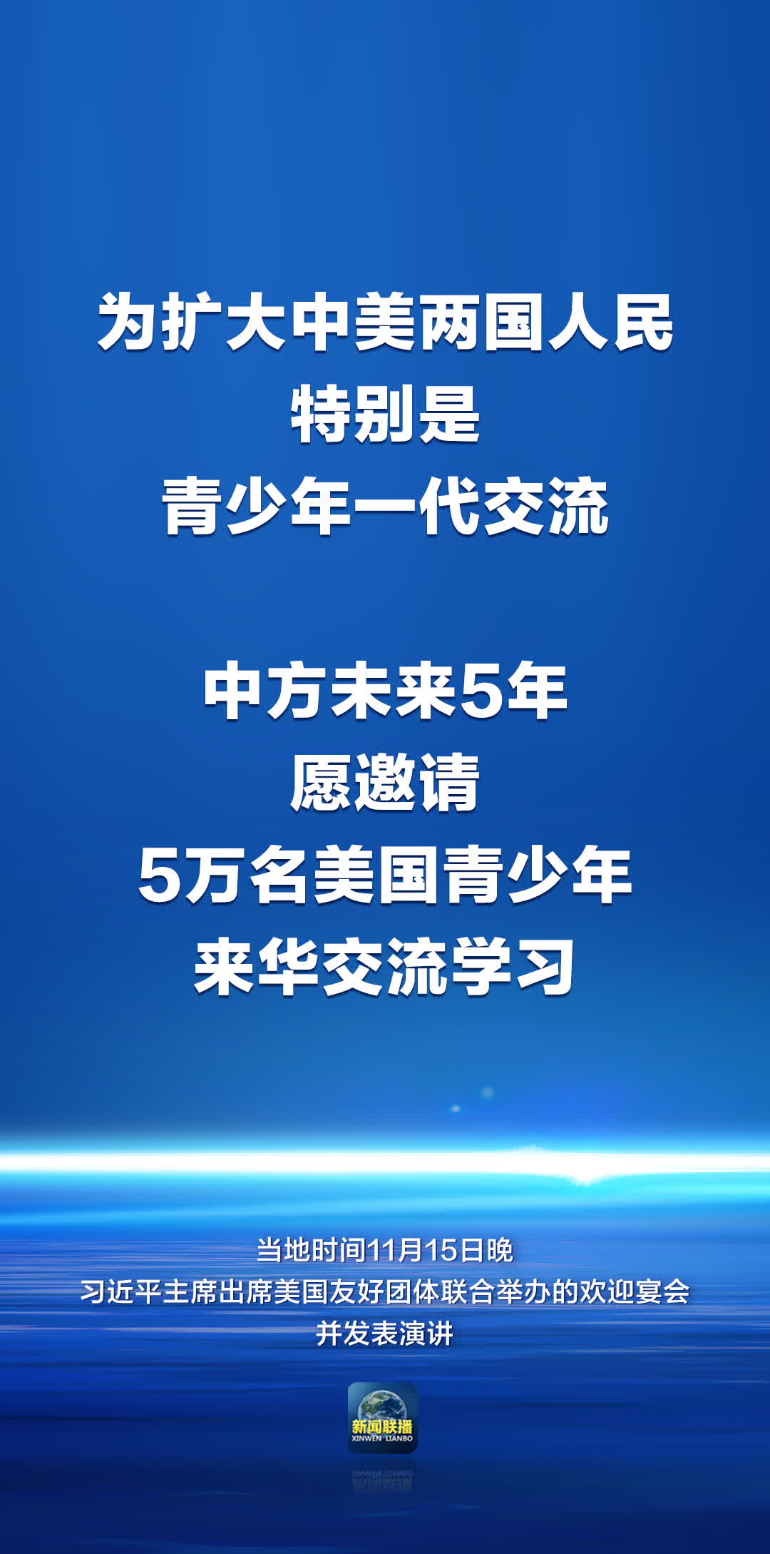 合作共贏是時代發展的潮流,也是中美關係應該有的底色。中國正致力於高質量發展,美國也在着力振興經濟,雙方合作空間無限廣闊,完全可以相互成就、互利共贏。雙方應該推動兩國在外交、經貿、人文、教育、科技、農業、軍隊、執法、禁毒、人工智能等領域開展對話合作。為擴大中美兩國人民特別是青少年一代交流,中方未來5年願邀請5萬名美國青少年來華交流學習。