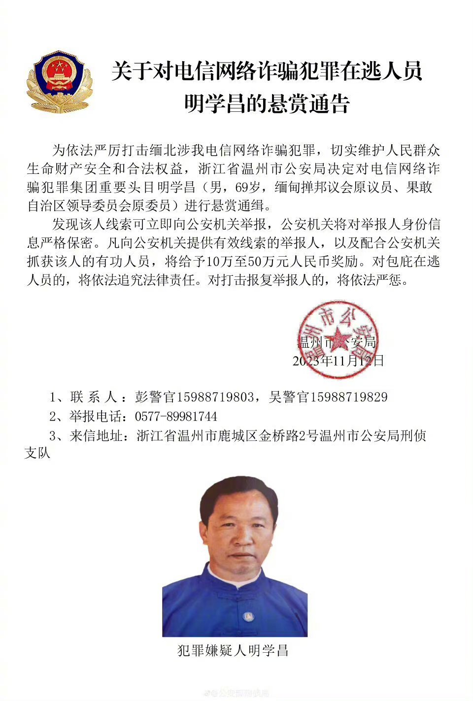 緬北涉中國電信網絡詐騙犯罪形勢嚴峻。公安機關偵查發現,以明學昌為首的犯罪集團長期組織開設詐騙犯罪窩點,公開武裝護詐,實施針對中國公民的電信網絡詐騙犯罪活動,詐騙數額巨大,在公安機關嚴打高壓態勢下,仍不收斂、不收手,繼續大肆組織實施違法犯罪活動,並涉嫌故意殺人、故意傷害、非法拘禁等嚴重暴力犯罪,情節極其惡劣、危害極其嚴重。在充分掌握相關犯罪事實和證據基礎上,11月12日,浙江溫州公安機關決定對明學昌、明國平、明菊蘭、明珍珍4人公開懸賞通緝。