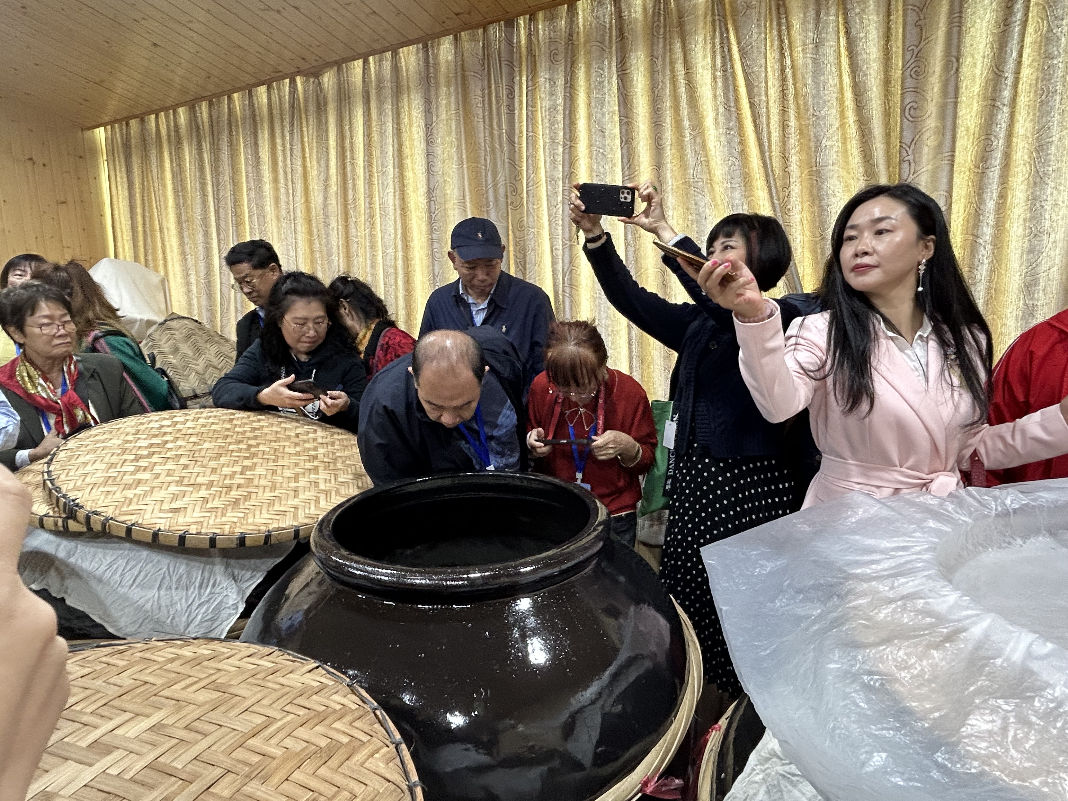 在西樵旺閣漁村的天台上,一口口巨大的土陶缸整齊擺放着,有的蓋着竹鬥笠,有的蓋上特別設計的玻璃。吳榮開揭開一個醬油缸蓋,在場所有參訪團成員立即聞到一股濃郁的醬油香味。