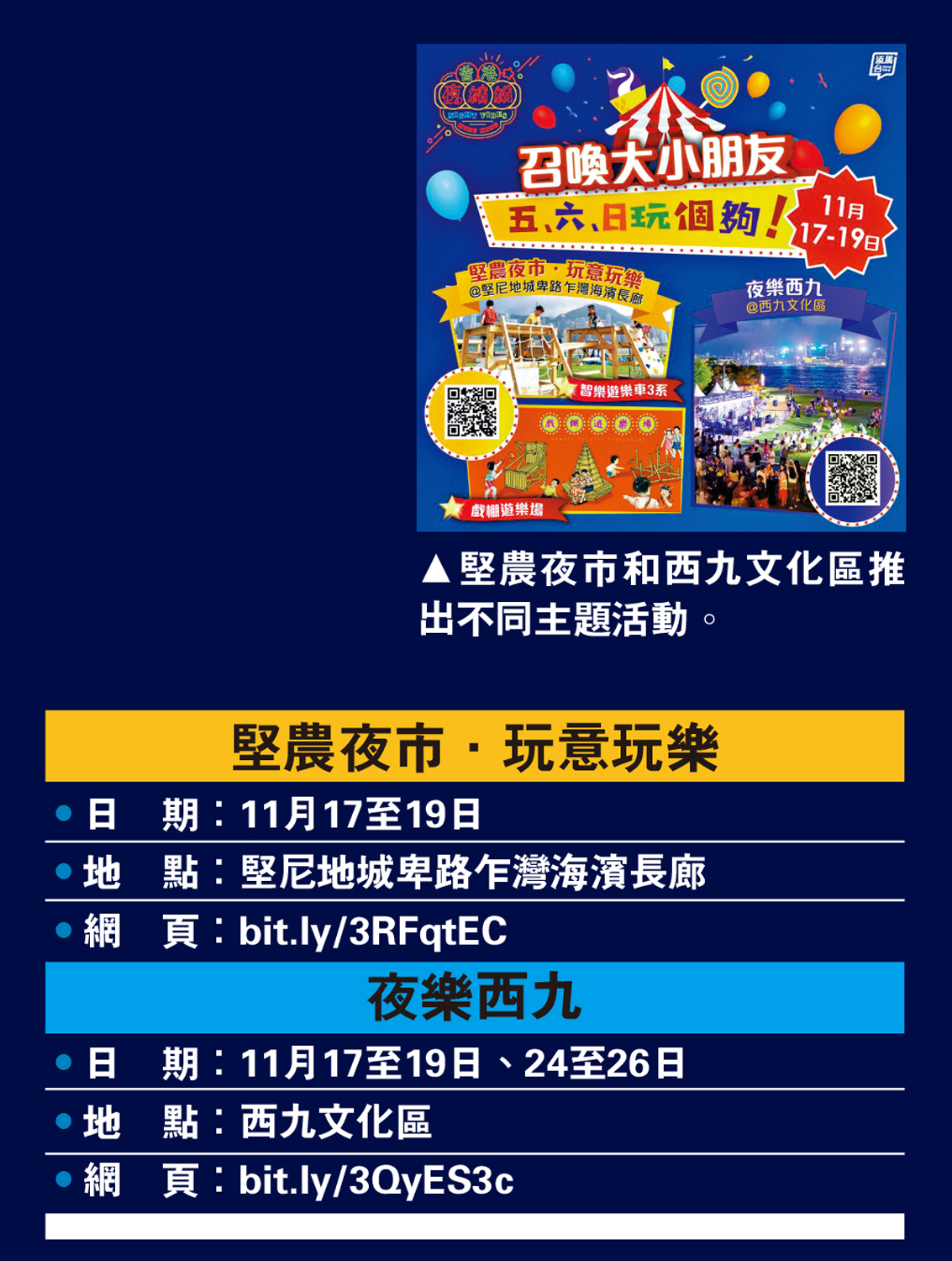 香港夜繽紛,好玩停不了!11月餘下兩個周末,堅尼地城海濱場地和西九文化區有不同主題活動,讓大家熱鬧一番。