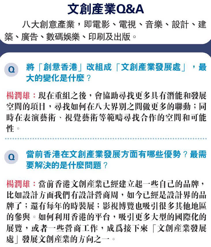 香港特區政府文化體育及旅遊局局長楊潤雄,與「創意香港」助理總監曹黎淑霞、麥聖希近日接受《大公報》專訪,詳述改革帶來的好處。楊潤雄表示,「文創產業發展處」會協助八大創意產業之間更多聯動,並帶領香港文創產業推廣中西交融的特色文化,發揮背靠祖國、面向世界的優勢,尋找更多機遇,孕育香港IP(Intellectual Property)。