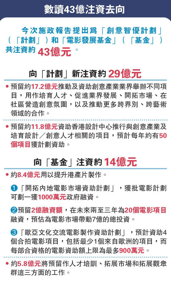 施政報告提出的注資43億向電影發展基金和創意智優計劃,對於電影產業而言是一筆不小的數字。