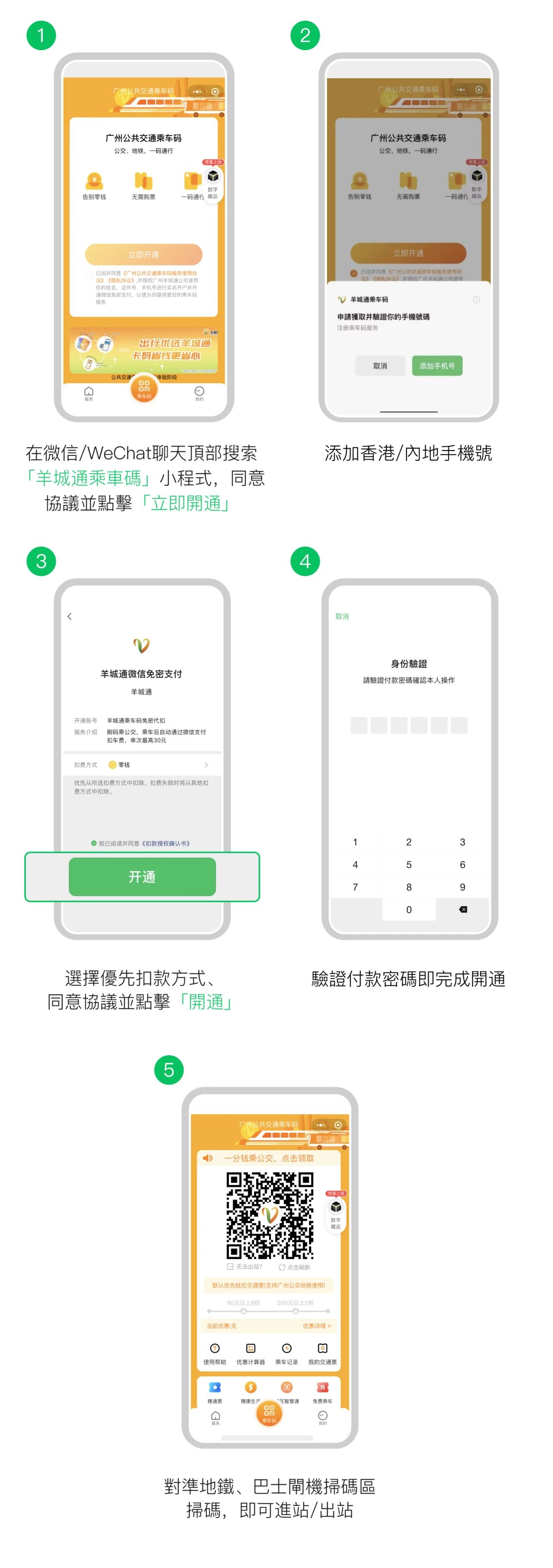 用戶可透過WeChat/微信進入「羊城通乘車碼」小程序,或下載「羊城通」App,開通乘車碼之後即可透過WeChat Pay HK扣減車資。港人乘搭廣州公共交通工具,無需再費時排隊買車票及找續。系統自動兌換成港幣作結算,且不收取手續費,讓用戶能更盡情地暢遊廣州。