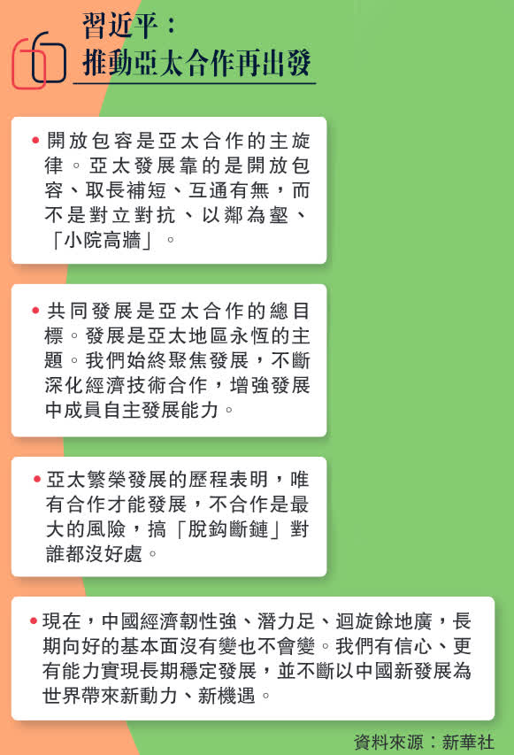 我們要共同維護聯合國憲章宗旨和原則,堅持對話而不對抗、結伴而不結盟的國與國交往之道,維護亞太繁榮穩定。亞太不能也不應該淪為地緣博弈的角鬥場,更不能搞「新冷戰」和陣營對抗。要堅持開放的區域主義,堅定不移推進亞太自由貿易區進程,促進各國經濟聯動融通,打造合作共贏的開放型亞太經濟。要推進數字化、智能化、綠色化轉型發展,強化科技創新和成果轉化,推進數字經濟和實體經濟深度融合,攜手完善全球科技治理,營造開放、公平、公正、非歧視的科技發展環境。