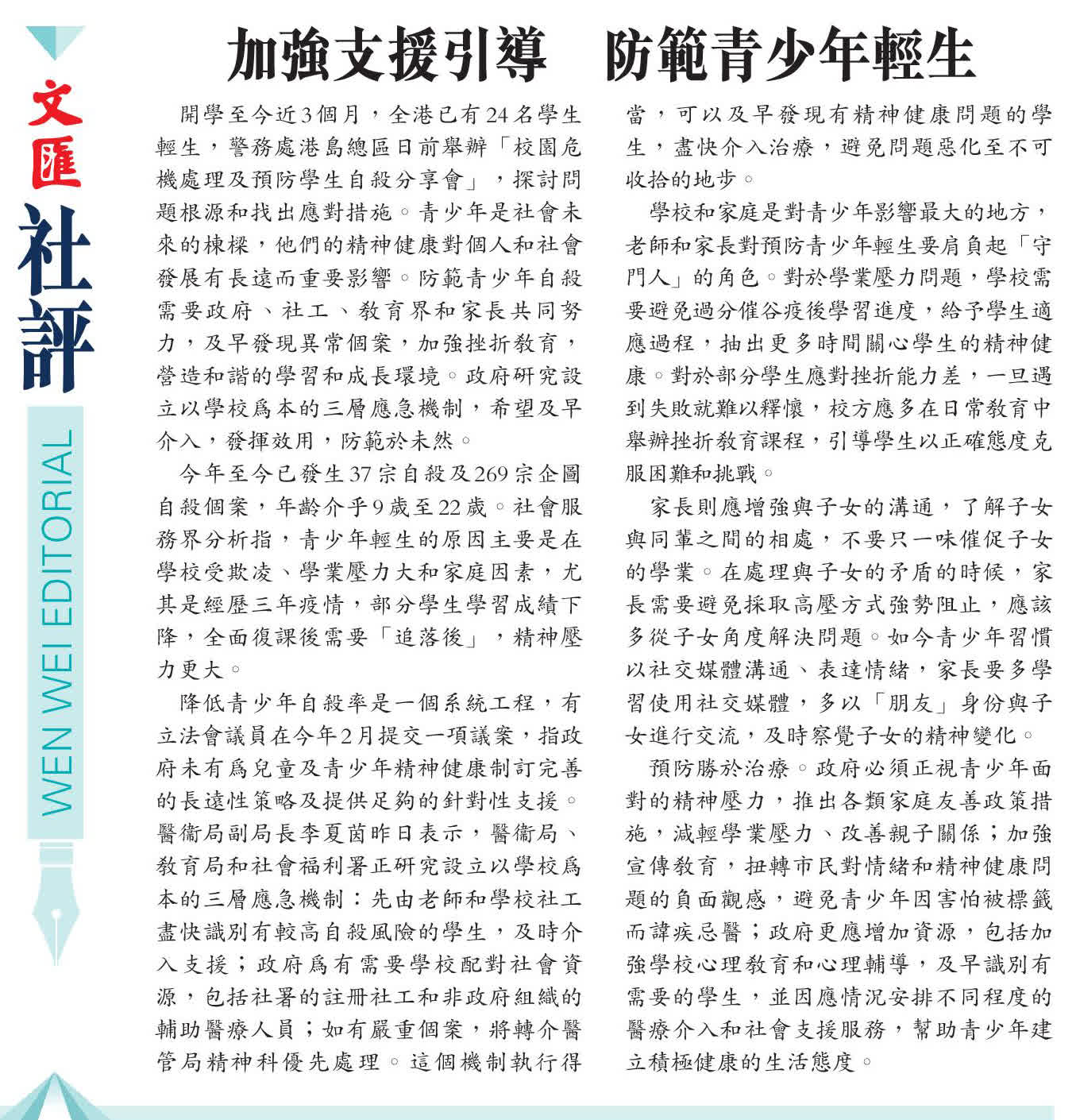 開學至今近3個月,全港已有24名學生輕生,警務處港島總區日前舉辦「校園危機處理及預防學生自殺分享會」,探討問題根源和找出應對措施。青少年是社會未來的棟樑,他們的精神健康對個人和社會發展有長遠而重要影響。防範青少年自殺需要政府、社工、教育界和家長共同努力,及早發現異常個案,加強挫折教育,營造和諧的學習和成長環境。政府研究設立以學校為本的三層應急機制,希望及早介入,發揮效用,防範於未然。
