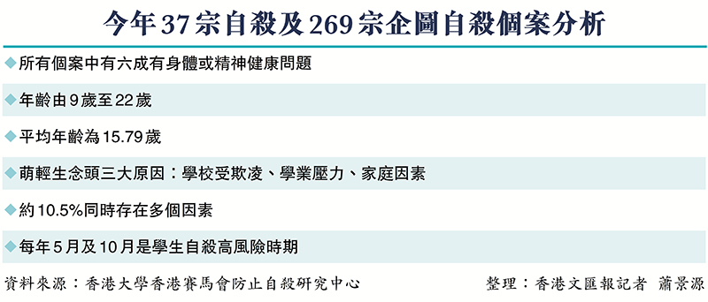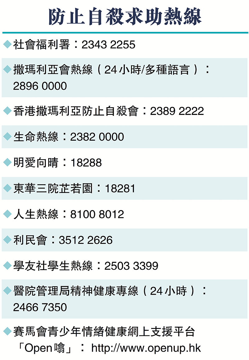 香港撒瑪利亞防止自殺會總幹事曾展國昨日接受香港文匯報記者查詢表示,青少年求助個案由今年7月起遞增,高峰期是10月的9宗,與去年同期相比升幅達33%,他呼籲家長、學校勿給青少年太大學業壓力,呼籲青少年有情緒問題後切勿「自己收埋」,要主動向師長、駐校社工等尋求專業意見。家長亦需多關心子女情緒變化,要明白「不是所有孩子都擅長讀書」,親子關係是最寶貴的財富,不要把孩子逼得太緊。