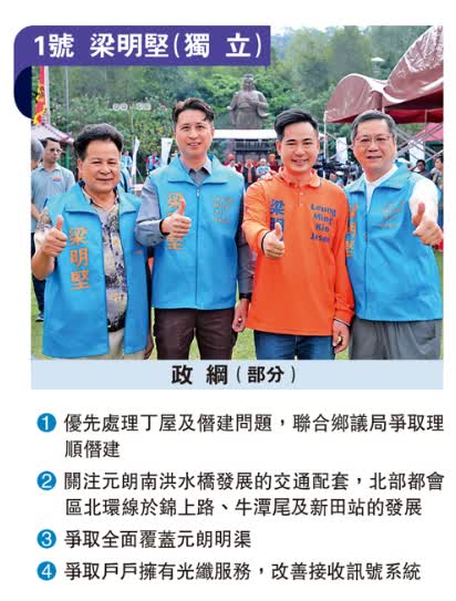 1號候選人梁明堅表示,自己從小在新界鄉村長大,每天穿梭田野,「是鄉下仔一名」。他認為,元朗鄉郊東選區範圍大,所以爭取城鄉共贏是至為重要。事實上遷入鄉郊的城市人,大都喜愛鄉村文化,尊重鄉村文化,支持城鄉共融。