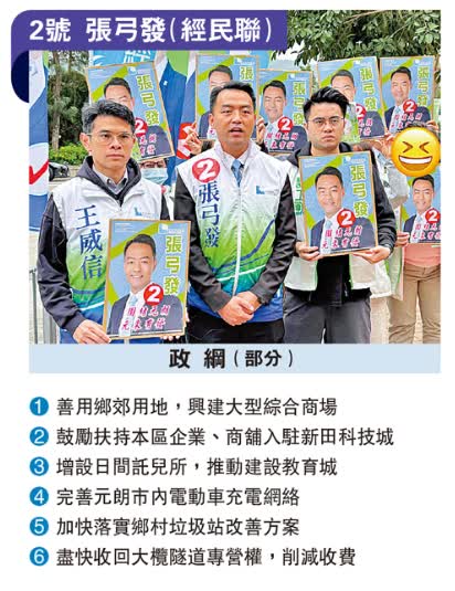 2號候選人張弓發畢業於浸會大學新聞系,從事過記者行業,又擁有7年社區主任經驗。他說,自己一直都非常熱衷於研究時事及市政管理,在7年的社區工作裏面,了解到很多市民的需求與想法,因此想通過此次區議會的選舉,在議會工作中實踐自己的理念,「市政為民,基建先行」,以及「工商帶動經濟,專業改善民生」。他希望通過大型基建,拉動經濟,從而提供更多就業職位,同時為市民提供便利,同時推經濟、為民生;共發展,謀幸福。