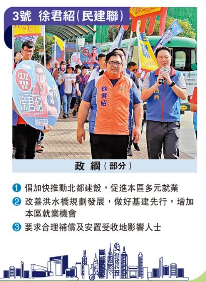 3號候選人徐君紹2004年開始投入地區工作,現時於元朗洪水橋洪福邨服務。他認為,元朗鄉郊東選區範圍廣,選區屬數一數二之大,所以一定要團隊夠「硬淨」,才可以應付全區居民各式各樣的求助。今屆選舉競爭和挑戰並存,區內相關的議題和市民的需求也有不同。他指出,資訊傳遞是作為區議員的重要工作,市民的需求可以通過區議員反映給相關政府部門。