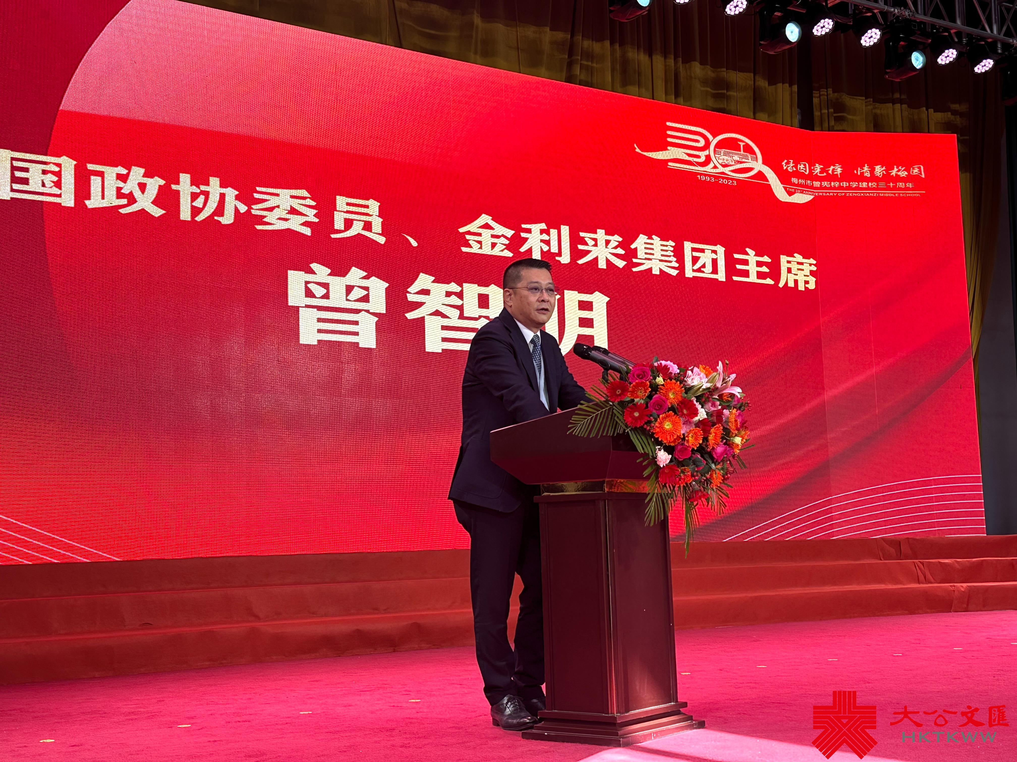 (大公文匯網記者 胡若璋)細數神州大地的教育版圖,港人捐資興建的學校不勝枚舉。在廣東梅州,30年前,情系桑梓的曾憲梓在梅水之南親手種下一棵光明樹,並捐資逾2000萬元創辦曾憲梓中學,為家鄉育人添才。18日,曾憲梓中學迎來建校30周年慶典。子承父業、家鄉興學,全國政協委員、金利來集團主席曾智明表示,會好好傳承父親熱心教育的精神,將出資建設新的教學大樓,繼續支持家鄉梅州的教育,爭上一個新台階。
