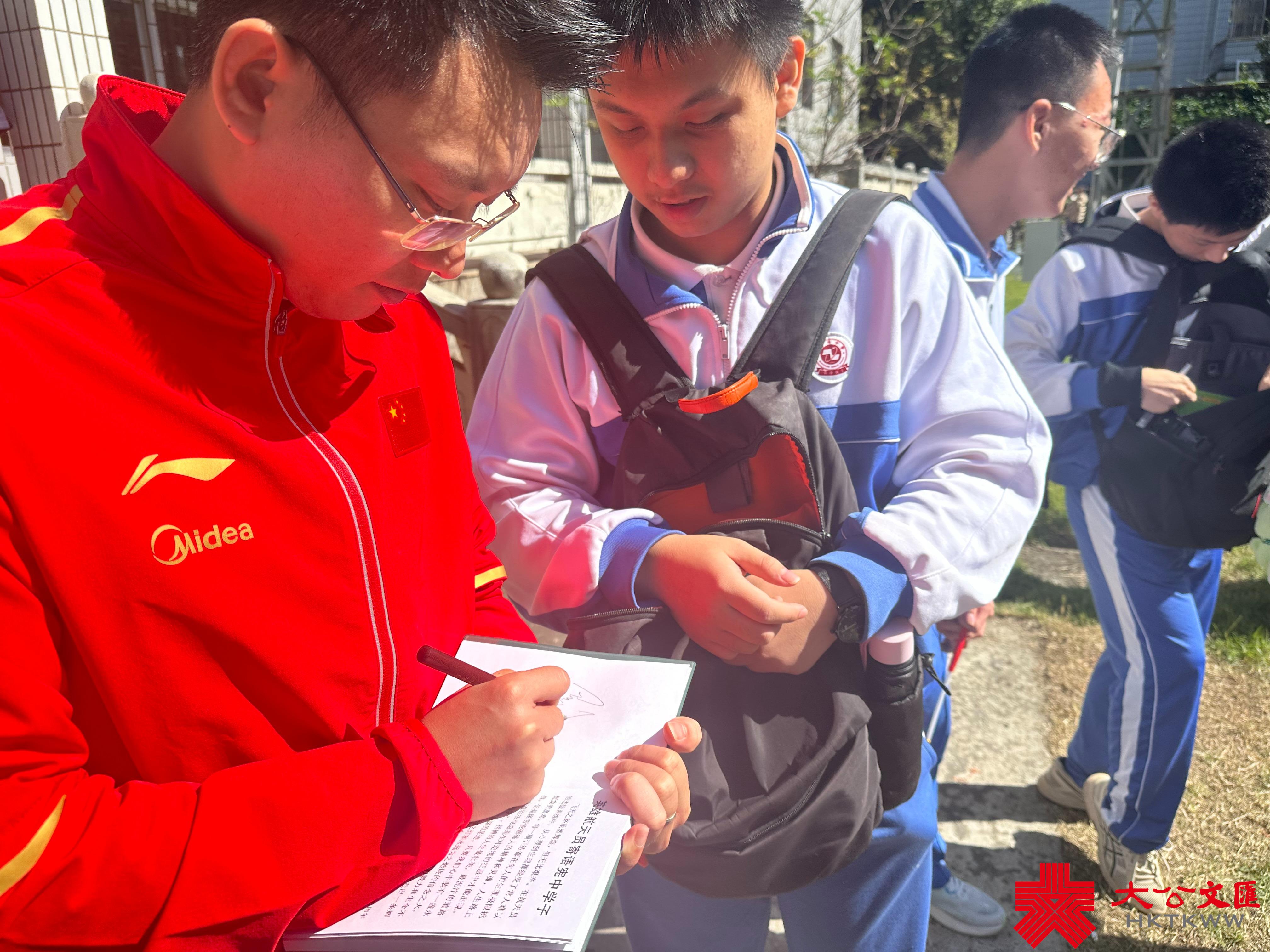 從20世紀70年代開始,曾憲梓除積極支持國家教育外,還特別注重體育和航天等事業,其名下還設有體育和載人航天基金。過去不少航天員和奧運冠軍們也多次到訪曾憲梓中學, 例如,航天英雄楊利偉、劉洋、劉伯明,奧運冠軍冼東妹、羅玉通、楊伊琳、王鑫、楊維等都和學生們進行近距離的「熱血追夢」的故事分享。此番,航天航空專家、原首批航天員兼航天員教練、一級航天員、一級飛行員吳傑、奧運跳水冠軍羅玉通、張雁全一併出現在校園,再次和朝氣蓬勃的學子們分享「強國有我」熱血奮鬥故事。