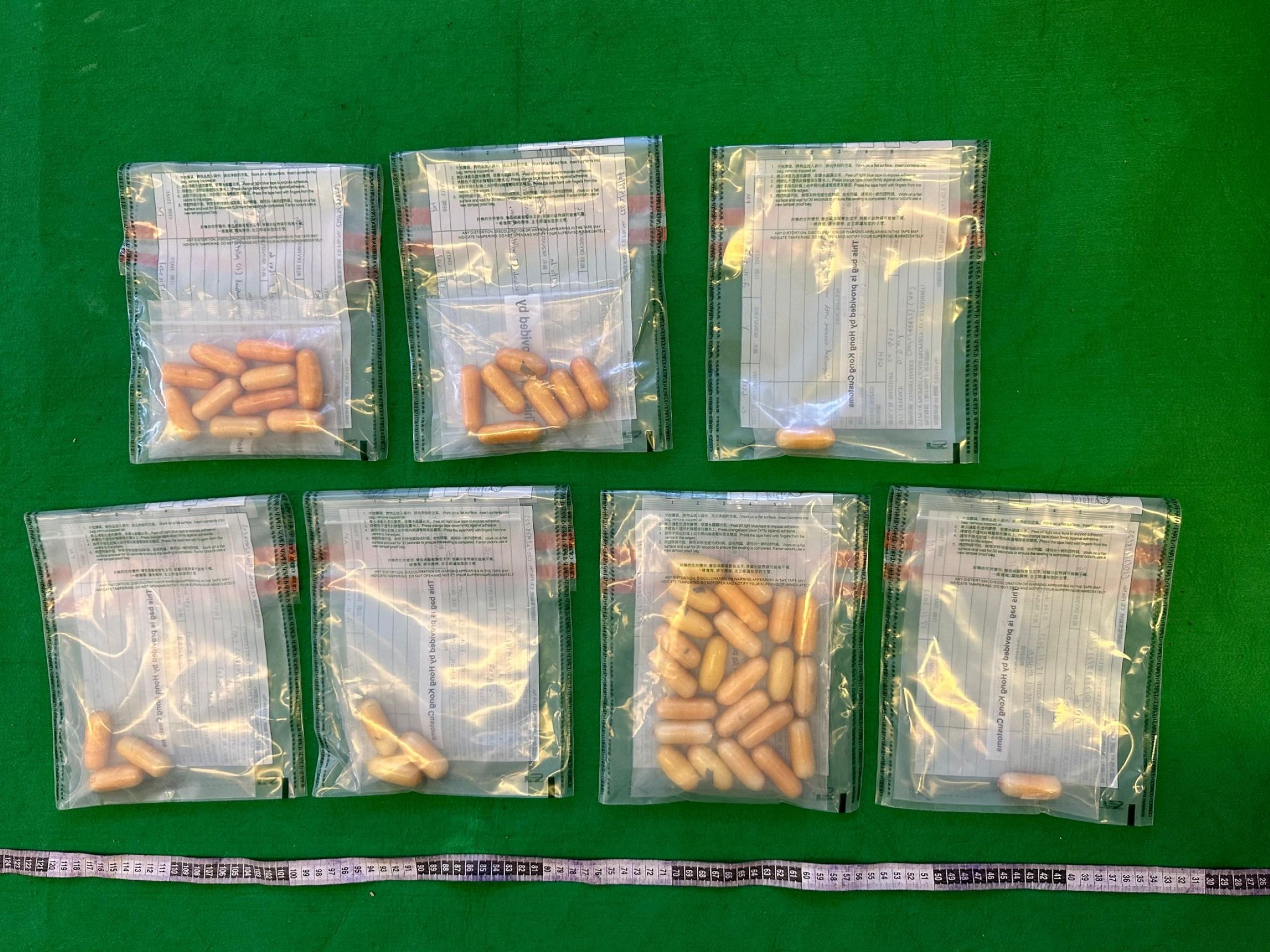 一名42歲的男旅客當日從肯亞內羅比經卡塔爾多哈飛抵本港。海關人員替該名旅客進行清關期間懷疑他體內藏有毒品,於是把他帶到醫院檢查。經檢查後,醫生確認該名旅客體內藏有異物,海關人員隨即把他拘捕。