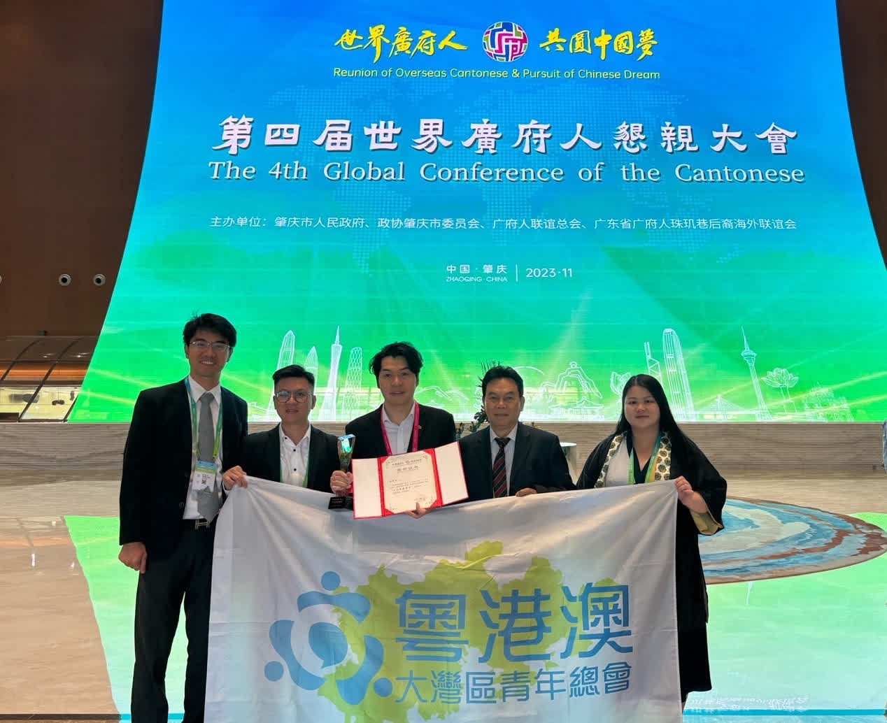 大會播放了海外僑團僑領的祝賀視頻,並表彰了第四屆世界廣府人「十大傑出人物」和「十大傑出青年」。廣東省政協常委、粵港澳大灣區青年總會主席吳學明榮獲「十大傑出青年」並代表發言,以團長身份帶領總會副主席馮家興、許法人、陸思敏等核心成員出席盛會。