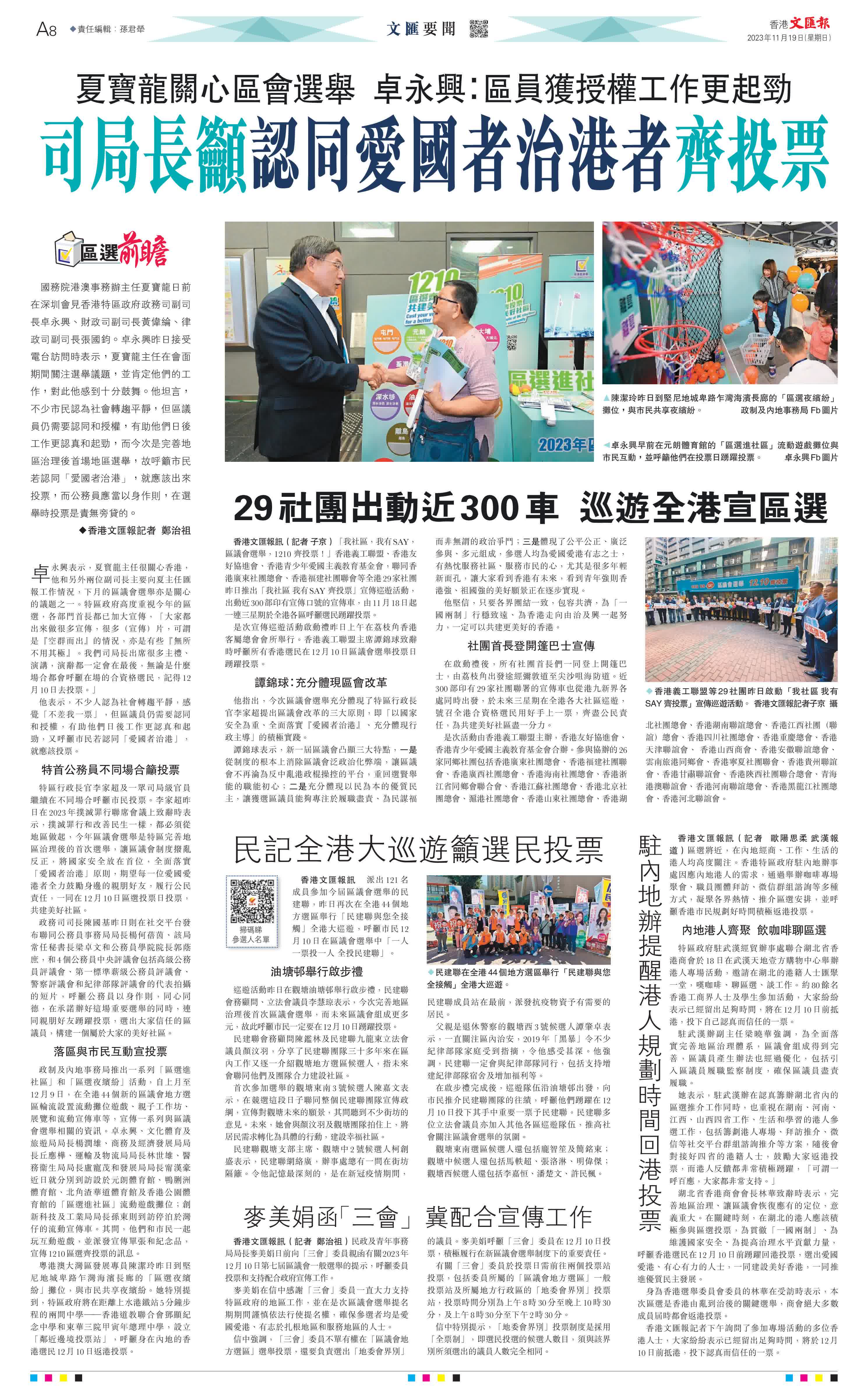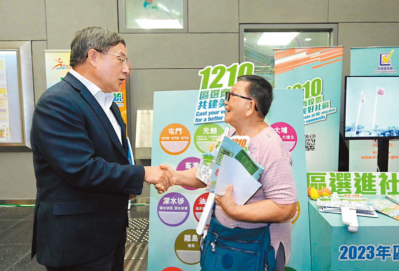 特區行政長官李家超及一眾司局級官員繼續在不同場合呼籲市民投票。李家超昨日在2023年撲滅罪行聯席會議上致辭時表示,撲滅罪行和改善民生一樣,都必須從地區做起,今年區議會選舉是特區完善地區治理後的首次選舉,讓區議會制度撥亂反正,將國家安全放在首位,全面落實「愛國者治港」原則,期望每一位愛國愛港者全力鼓勵身邊的親朋好友,履行公民責任,一同在12月10日區選投票日投票,共建美好社區。