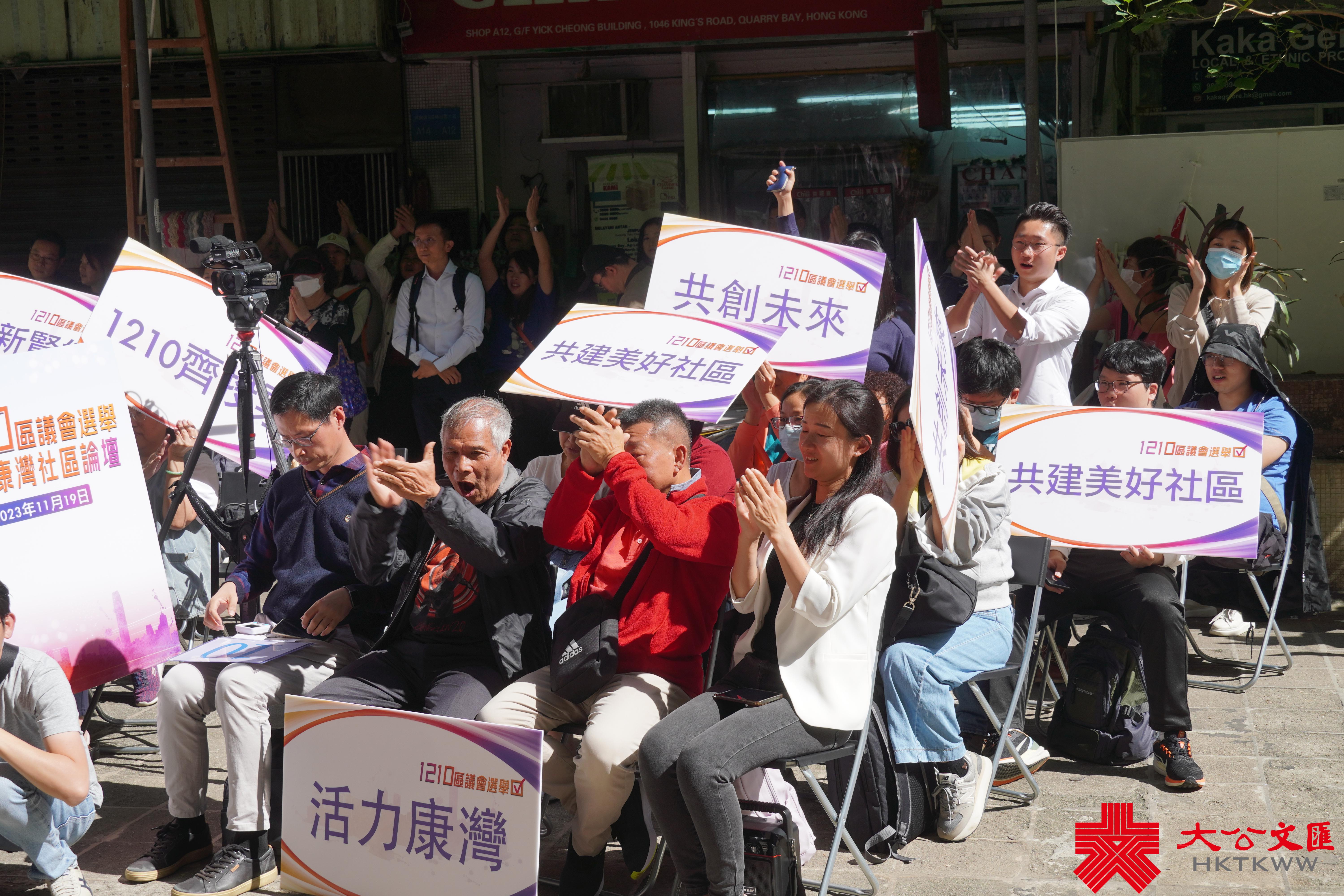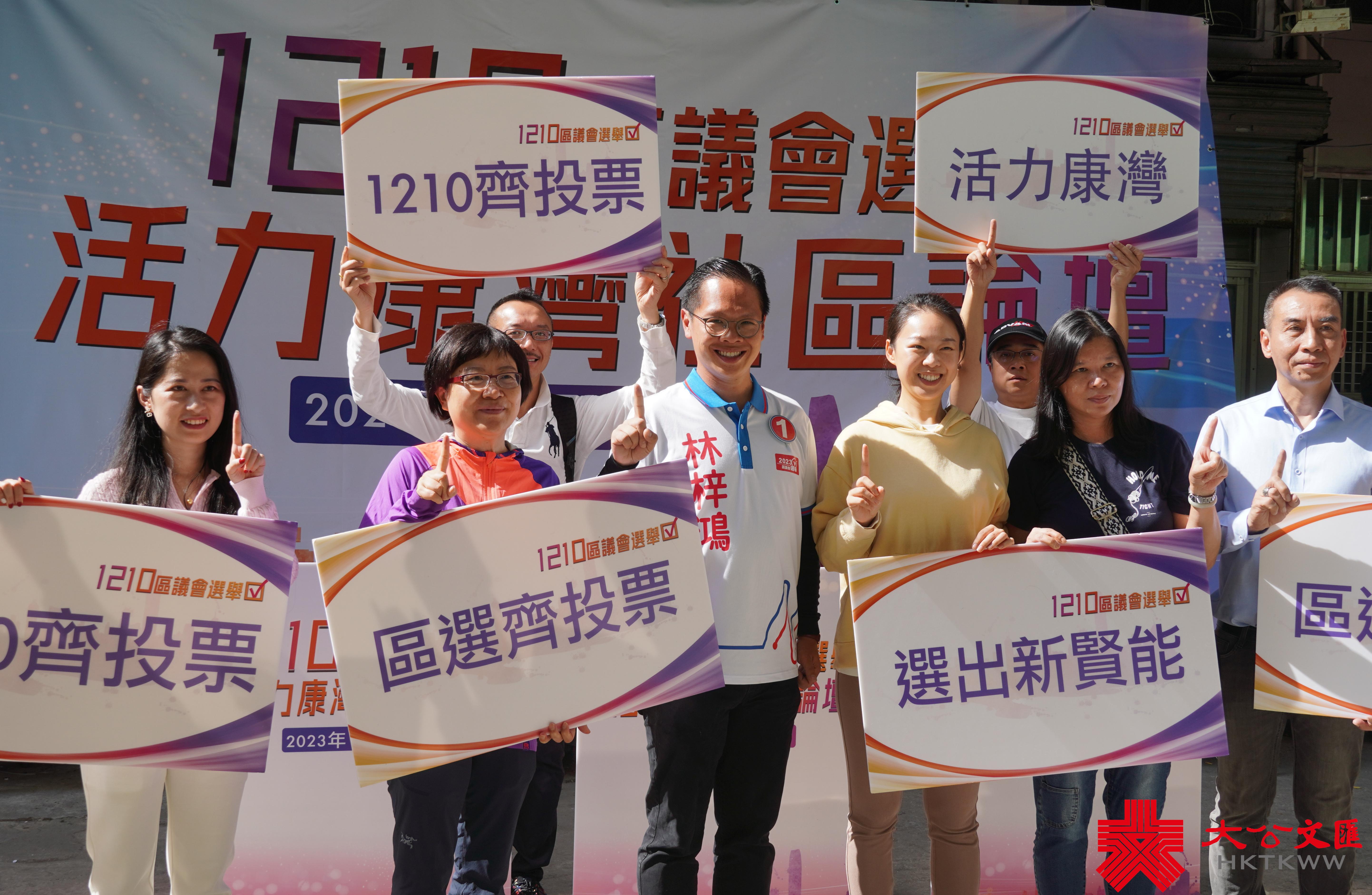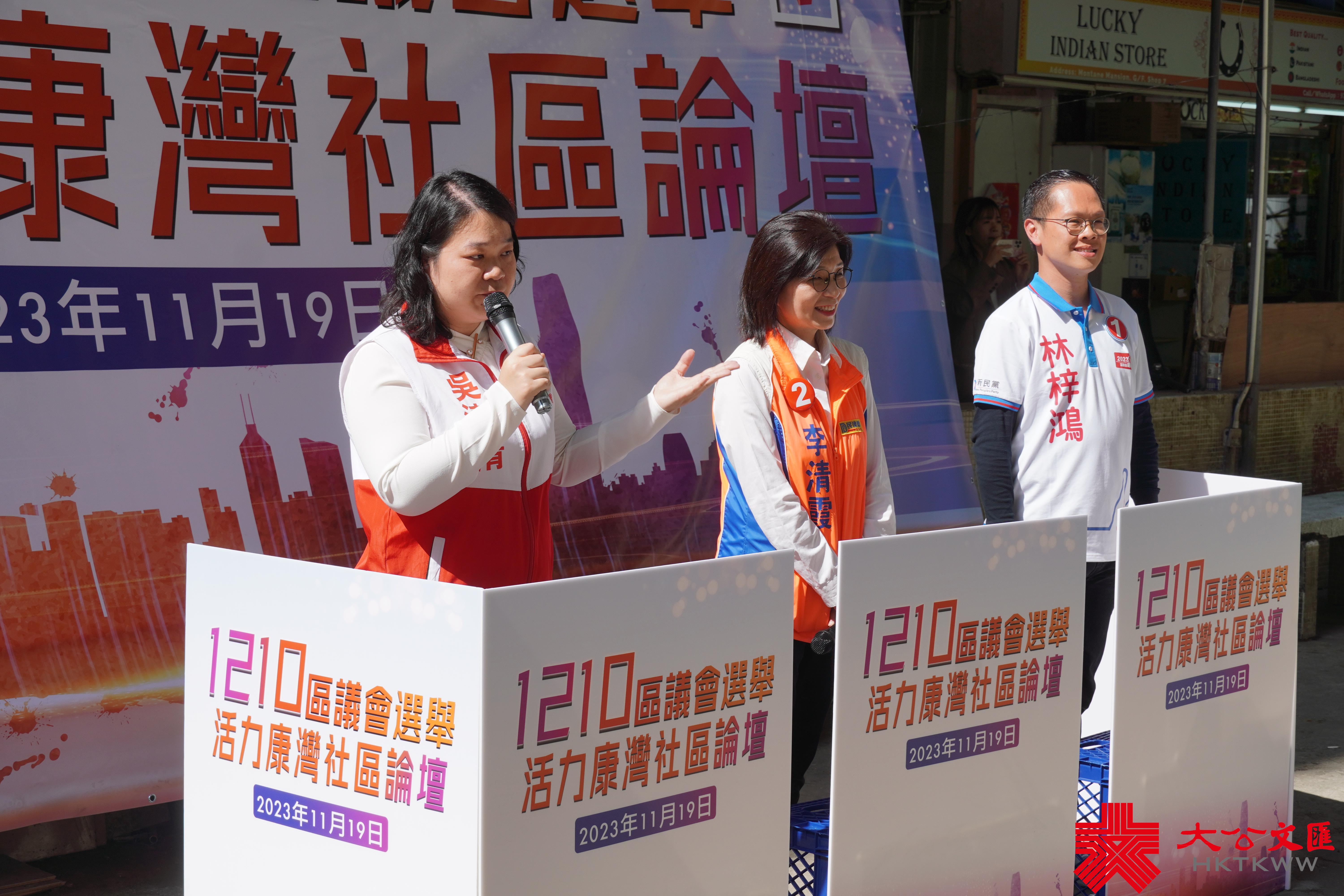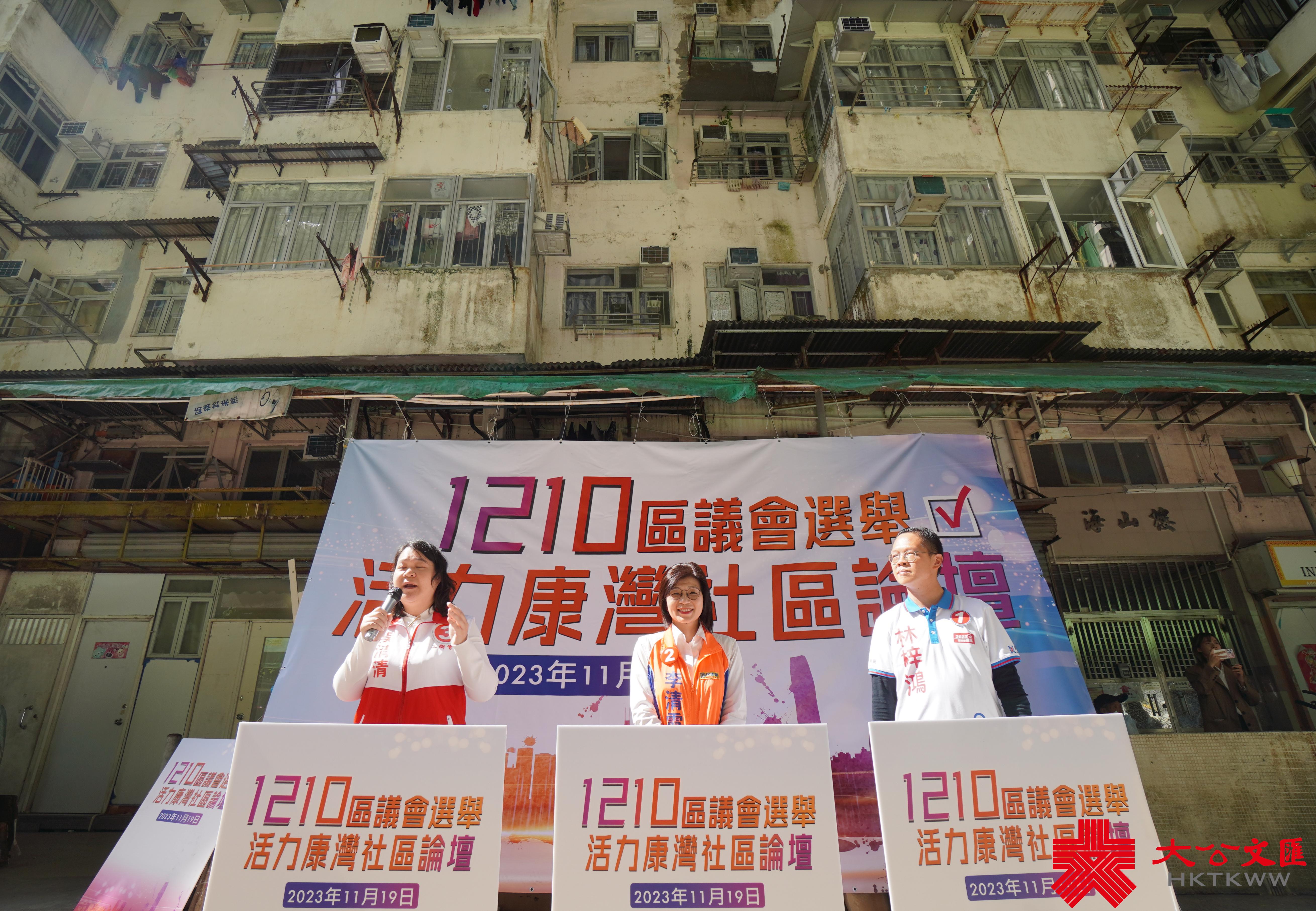 (大公文匯全媒體 記者 李九歌)2023年區議會選舉將於12月10日進行投票。「活力康灣社區論壇」今日(19日)上午在鰂魚涌海山樓舉行。候選人新民黨林梓鴻、民建聯李清霞、工聯會吳清清以及康灣社區居民和義工參與此次活動。