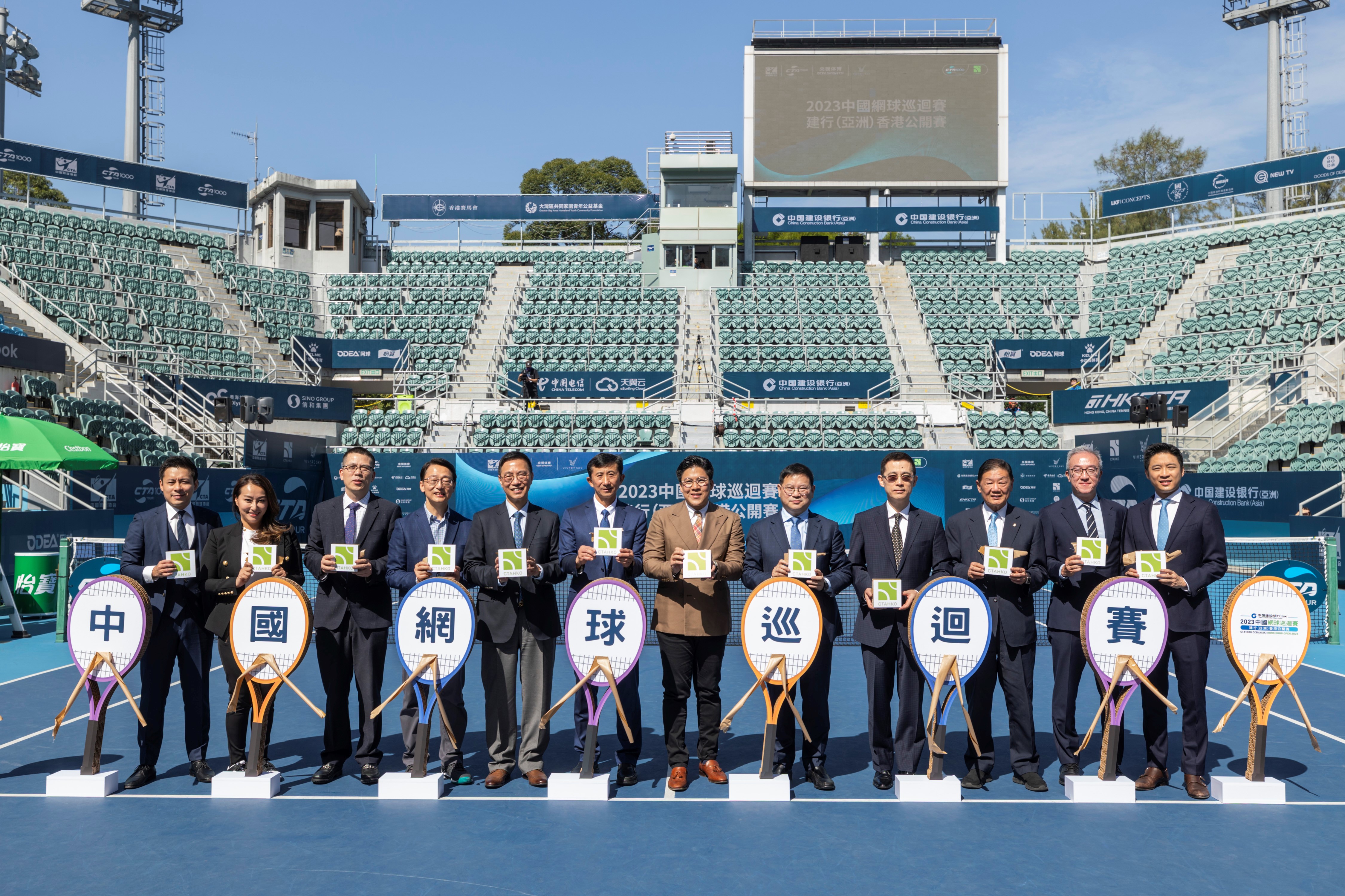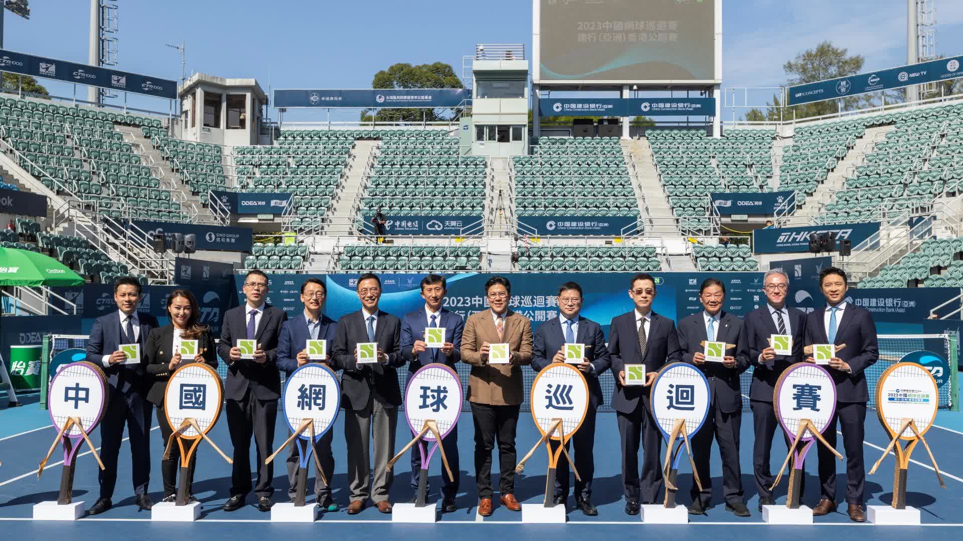 建行(亞洲)副董事長及行長張駿聯同「2023中國網球巡迴賽建行(亞洲)香港公開賽」籌委會主席霍啟剛、國家體育總局網球運動管理中心黨委書記及中國網球協會副主席白喜林、文化體育及旅遊局局長楊潤雄、中央政府駐港聯絡辦宣傳文體部副部長張國義、康樂及文化事務署署長劉明光、中國香港體育協會暨奧林匹克委員會副會長及亞洲網球協會永遠名譽副主席胡曉明、中國電信國際有限公司總經理尹進、德天集團主席霍啟山、大灣區共同家園青年公益基金副主席邱詠筠、「2023中國網球巡迴賽建行(亞洲)香港公開賽」籌委會副主席及中國香港網球總會會長莫君逸和德天集團執行董事霍啟人,一同出席開幕典禮並主持剪綵儀式。