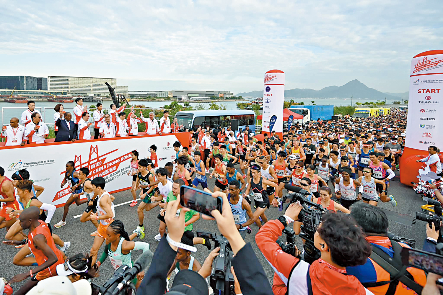 清晨7時40分,政務司司長陳國基等嘉賓在起點鳴槍,首批挑戰組選手在嘉賓與啦啦隊歡呼下,從港珠澳大橋香港口岸出發,開啟跨海馬拉松之旅。