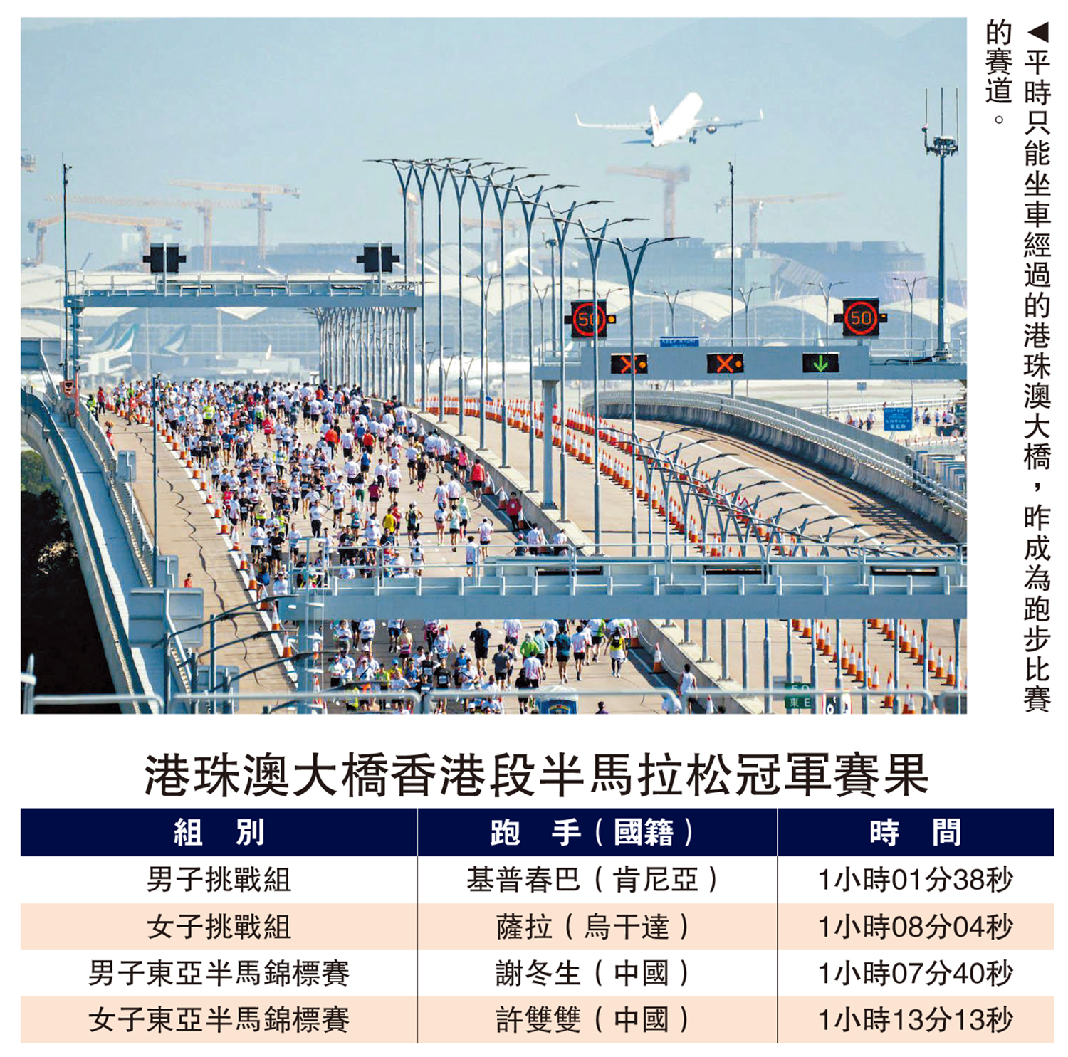 大公報報道,19日,首屆中國銀行(香港)港珠澳大橋香港段半馬拉松在港舉行,這是首個在港珠澳大橋舉辦的大型體育賽事,同場還舉行首屆東亞半馬拉松錦標賽,吸引約8000名選手,在這條全球最長的橋隧組合跨海通道進行競速,考驗意志和耐力。
