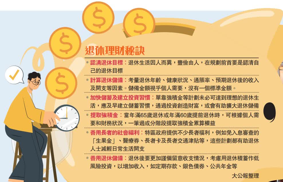 香港投資基金公會調查強積金計劃成員顯示,現今港人37歲開始規劃退休,受訪者預計需要760萬元,退休後方能維持現有生活水平。不少港人擔心退休後,生活不但不「優」,反而是樣樣「憂」。有立法會議員建議政府優化強積金安排,提高回報率應對通脹,用好大灣區發展機遇,完善配套政策,讓港人可安心北上安享晚年。
