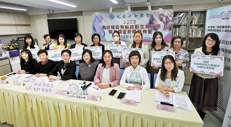 為了解香港女性對生育的意願,九龍婦女聯會於11月初進行問卷調查,成功收集734份問卷,並於同月邀請20名不同背景的受訪者進行聚焦訪談。該次調查有超過六成的受訪者是45歲以下,當中七成受訪者已曾生育,但其中僅一成受訪者表示有繼續生育的意願。在還未生育的婦女中,僅34.9%有生育計劃,當中超過半數人認為政府向初生嬰父母派發兩萬元,有紓緩經濟壓力作用,但認為此舉具吸引力的只佔22.4%。