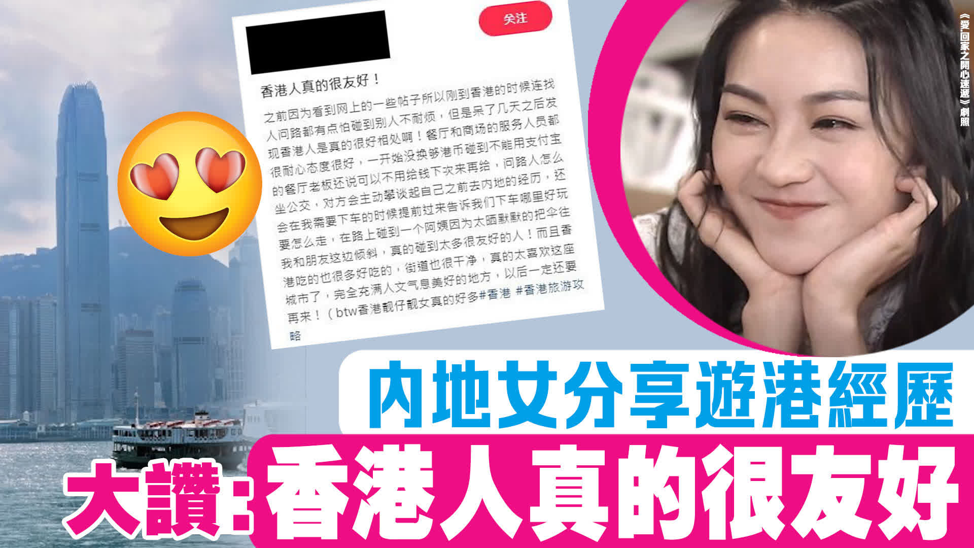 該名內地女生在小紅書以「香港人真的很友好!」為題發文,表示因遊港前曾看過網上的一些帖子,所以剛到埗時「連找人問路都有點怕碰到別人不耐煩」,但經過幾日後,便發現「香港人是真的很好相處啊!」她先是大讚「餐廳和商場的服務人員都很耐心、態度很好」,憶述有次她沒換夠港幣,又碰到不能用支付寶,沒想到餐廳老闆竟說「可以不用給錢下次來再給」。其次,她向路人詢問怎麼坐車時,對方會主動分享自己之前去內地的經歷,還在她下車前告訴她下車後有哪裏好玩要怎麼走。另外,她又提到在路上遇到一位熱心的「阿姨」,因為太曬而默默把傘往她及朋友那邊傾斜,直言「真的碰到太多很友好的人!」