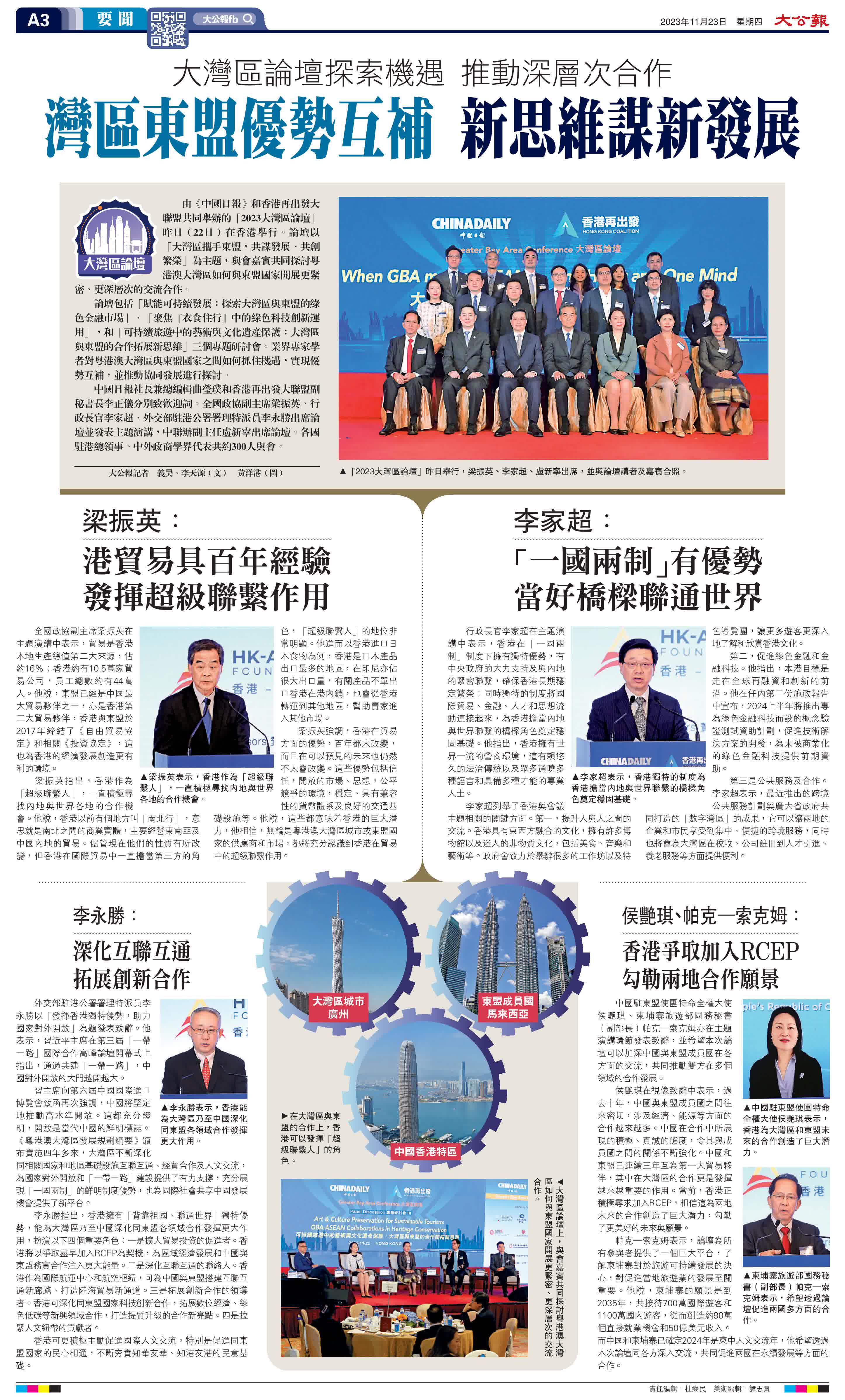 (大公報記者 義昊、李天源<文> 黃洋港<圖>)由《中國日報》和香港再出發大聯盟共同舉辦的「2023大灣區論壇」昨日(22日)在香港舉行。論壇以「大灣區攜手東盟,共謀發展、共創繁榮」為主題,與會嘉賓共同探討粵港澳大灣區如何與東盟國家開展更緊密、更深層次的交流合作。
