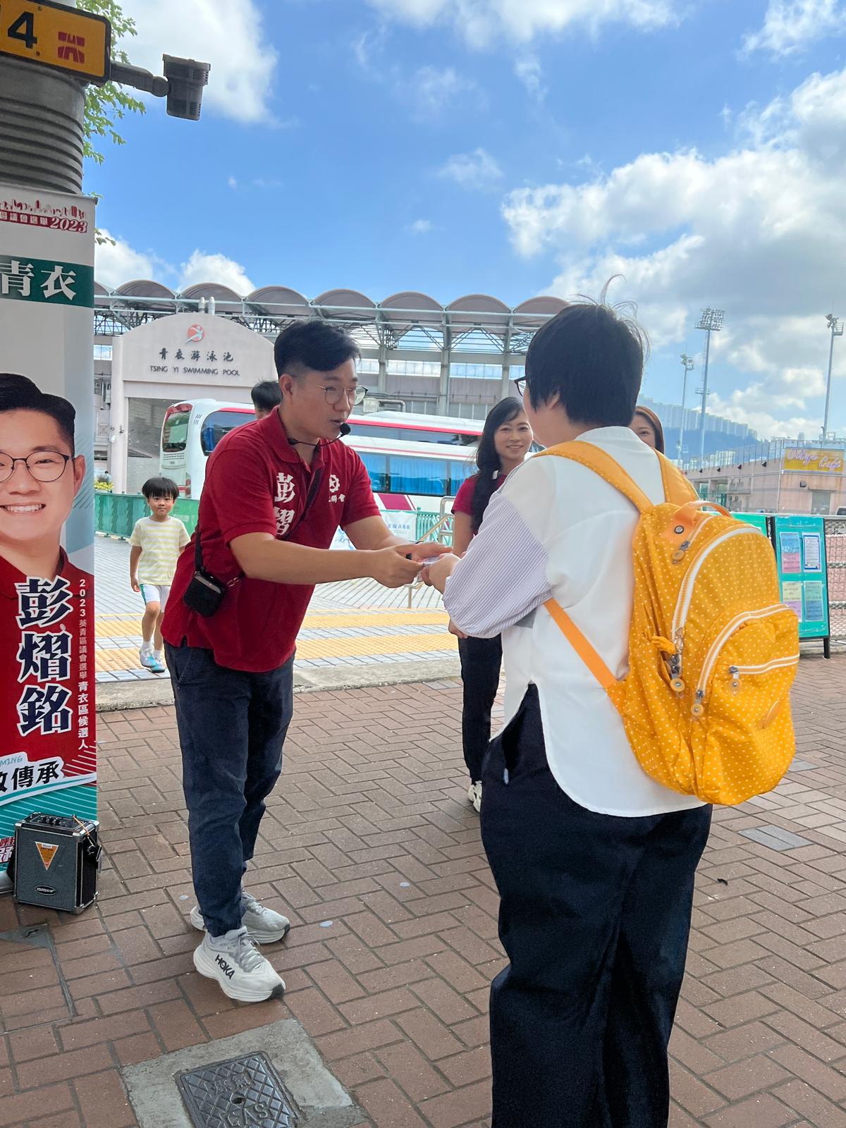 彭熠銘形容,自己深刻體會到工聯會前輩深耕細作數十載,每位前輩都秉承「撑勞工為基層」、「服務市民走在前」的熱誠,正如其競選口號「銘記初心,勤政傳承」,他會牢記工聯會前輩的教導,用年輕人的魄力和幹勁,去做得更多、更好,期望能為青衣帶來更好的一面,做到不負工聯、不負市民。
