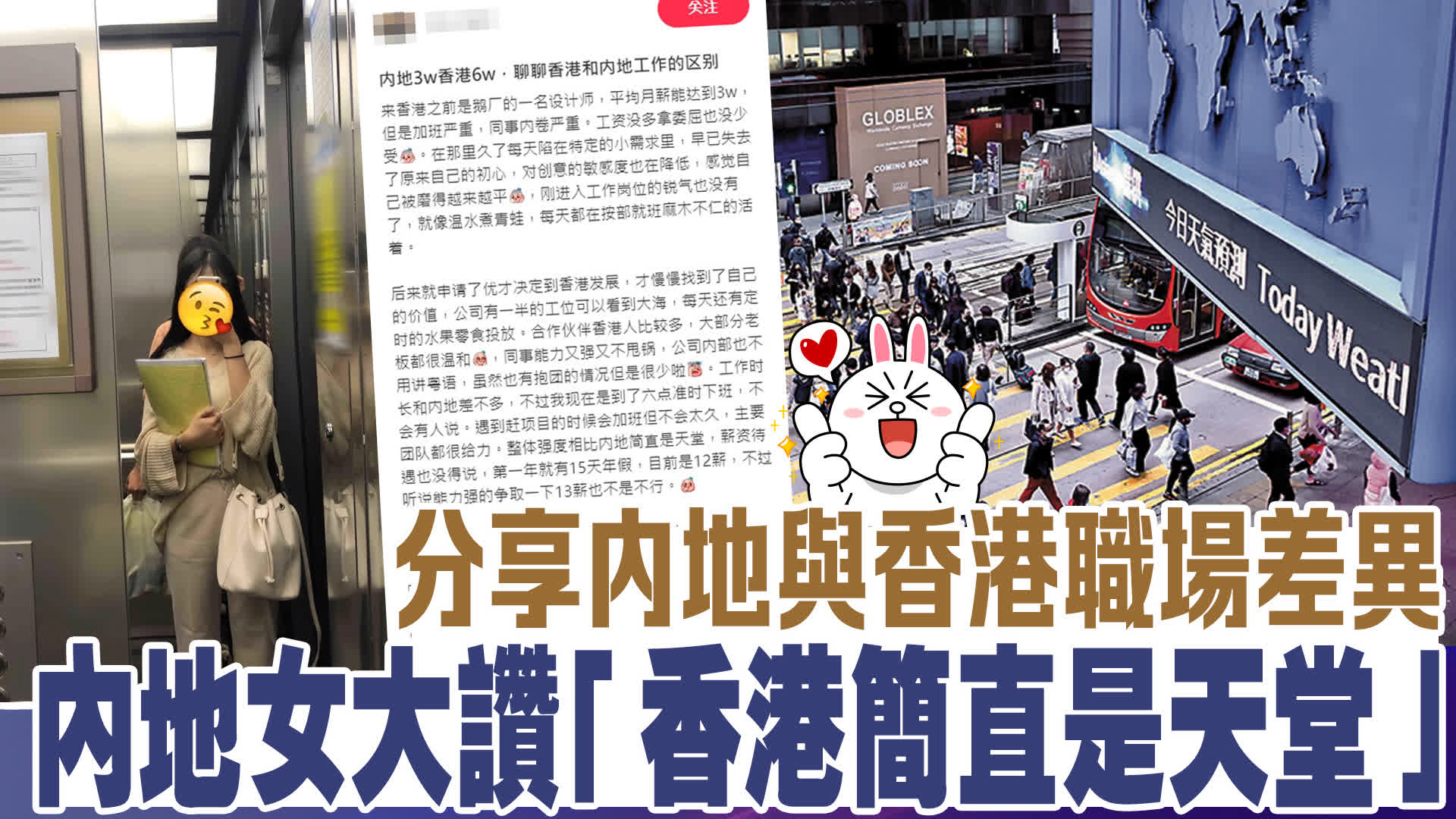 大公文匯全媒體報道,近日有一位透過優才計劃從內地來港工作的女設計師,在小紅書上分享中港職場文化的分別,表示來港後才慢慢找到自己的價值,認為相比起來香港「簡直是天堂」,直言「在香港的生活狀態是遠遠大於內地的,不管是為了賺錢還是以後的發展,我暫時還是會在香港」。