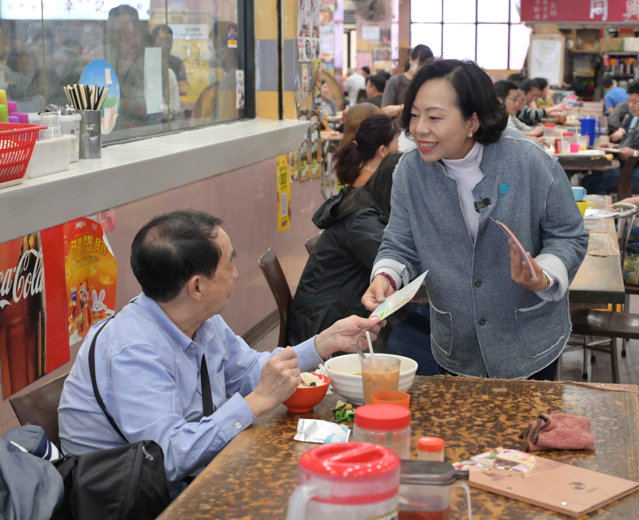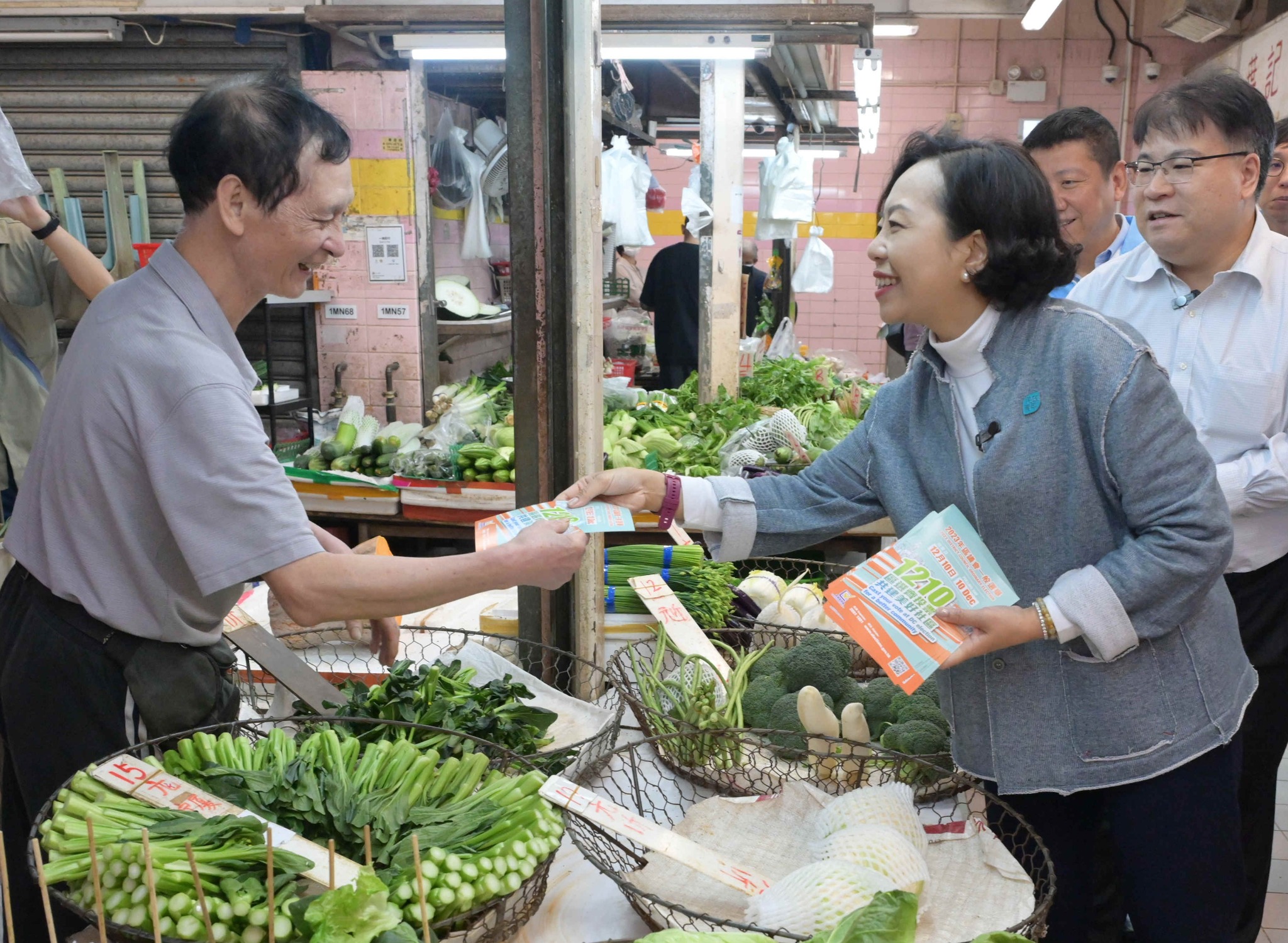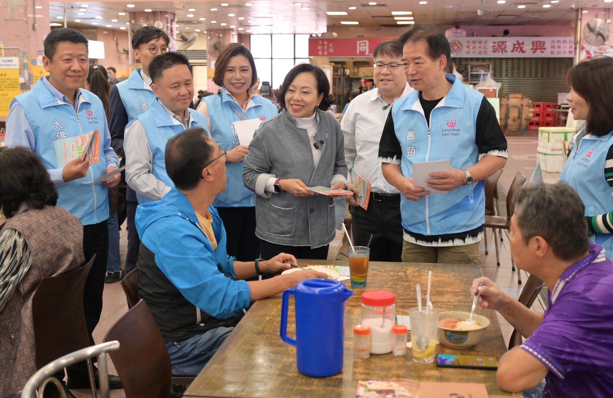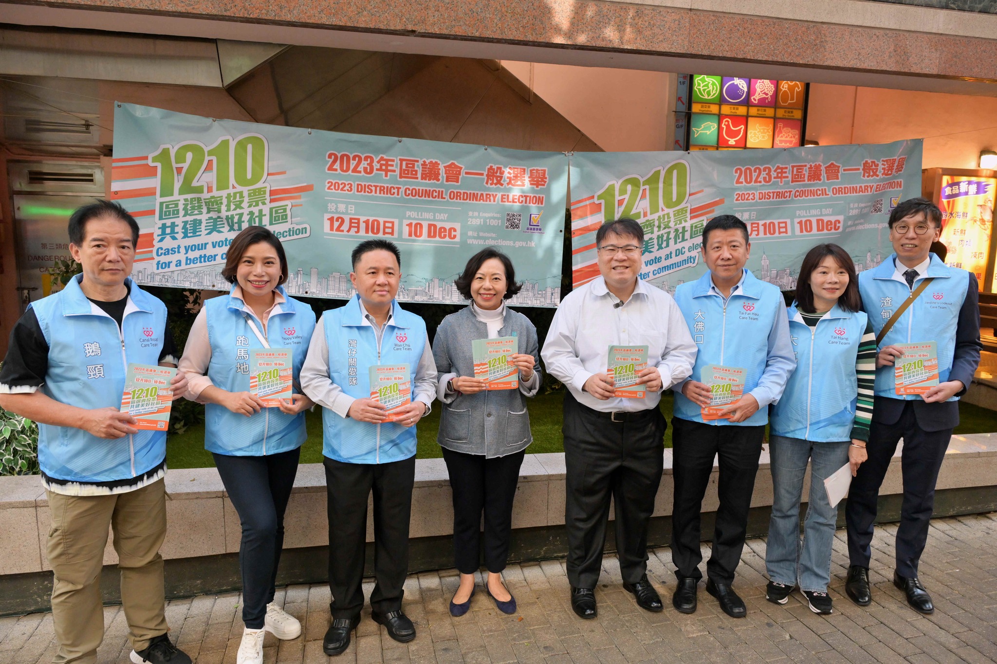 大公文匯全媒體報道,12月10日是新一屆區議會選舉的投票日。民政及青年事務局局長麥美娟今日(23日)聯同灣仔關愛隊隊員,到堅尼地城士美非路街市同熟食中心,一次過「洗街市」「洗食肆」,同街坊食客檔主宣傳區議會選舉,呼籲大家「1210齊投票」。