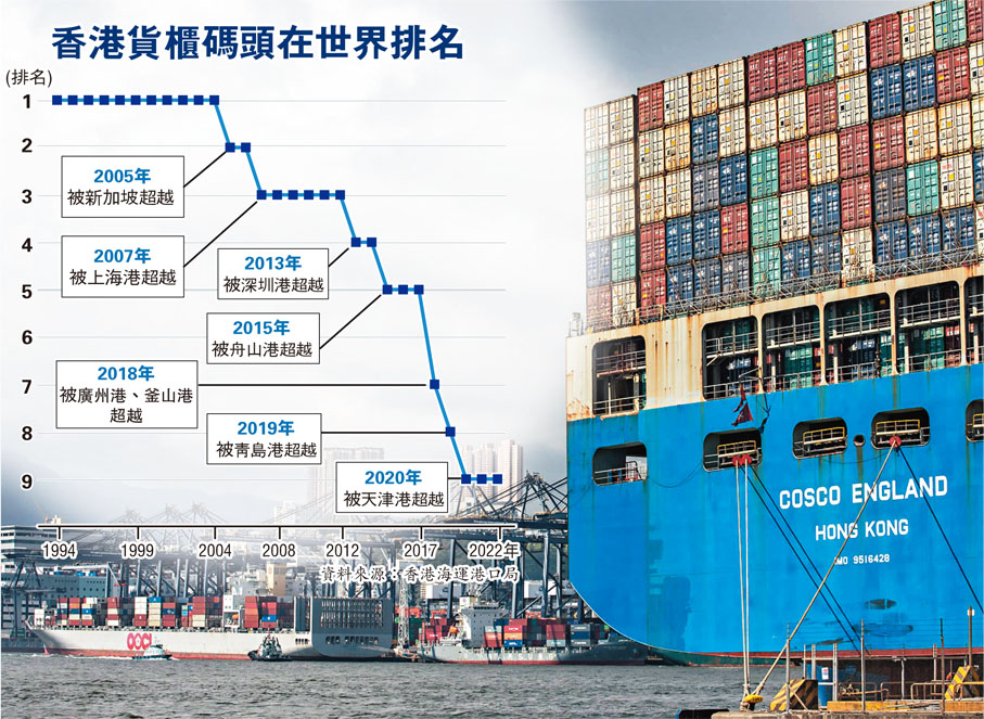 (香港文匯報 記者 莊程敏)曾經連續十多年蟬聯全球港口貨櫃吞吐量排行榜第一的香港,近年排名每況愈下。香港國際貨櫃碼頭(HIT)昨預計2023年香港港口貨櫃吞吐量,將由2019年時的1,800萬標準箱,跌至今年約1,400萬標準箱,將跌出全球港口吞吐量排行榜前十名。HIT指,近年面對全球經濟放緩、貿易需求下跌、地緣政局、疫情恢復緩慢,以及鄰近港口競爭等多項因素,葵青貨櫃碼頭吞吐量持續下降。而業內人士則認為,受到貨源腹地、成本等因素制約,香港貨櫃吞吐下跌是意料中事,香港的國際航運中心地位應該要朝高增值方向發展。