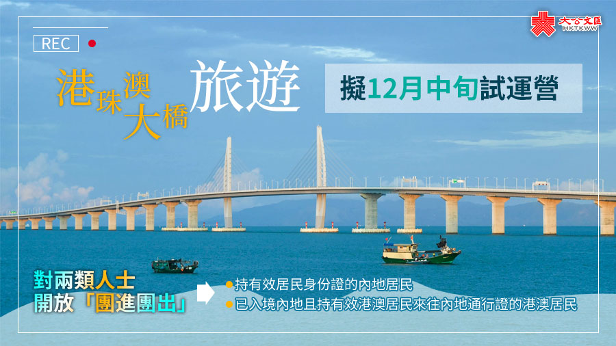 (大公文匯網 記者 方俊明)港珠澳大橋旅遊試運營開通新聞發布會今天(24日)在珠海舉行,宣布港珠澳大橋旅遊試運營將於今年12月中旬開通,開通後將增加港珠澳大橋海關監管區、口岸限定區域的旅遊功能,屆時港澳和內地居民將可以經大橋珠海公路口岸出發,參團遊覽大橋。
